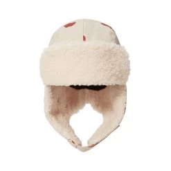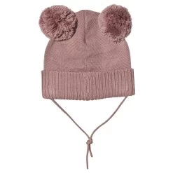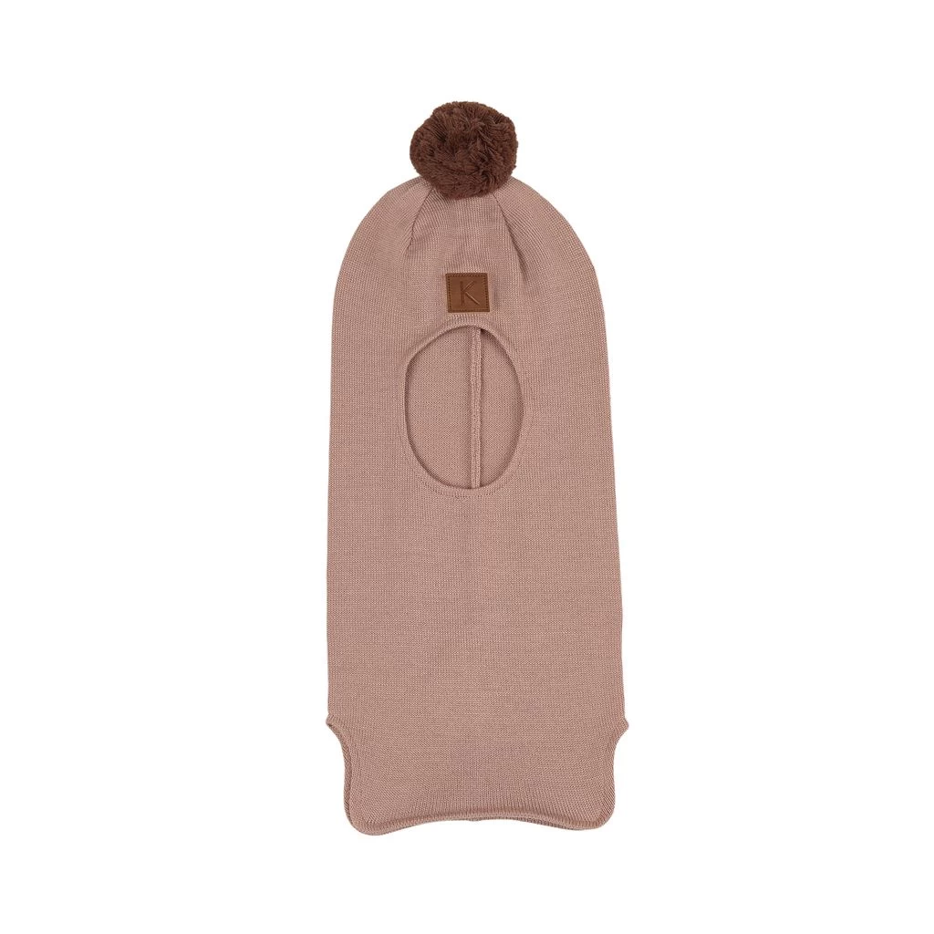 The perfect companion for cold winter days!. Pink Billund balaclava by Kuling. The balaclava has a knitted design. It has a pom-pom at the top.