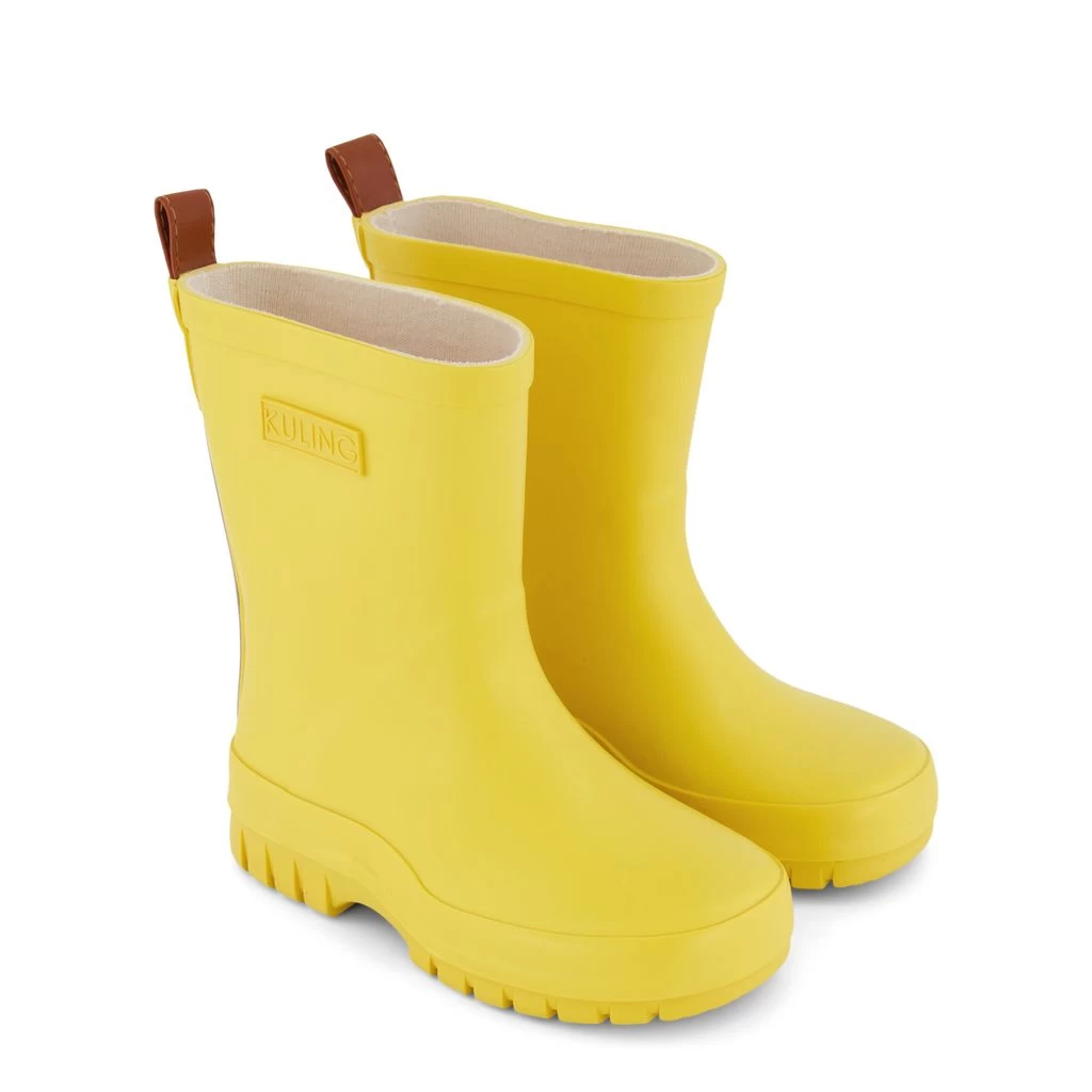 Time to jump through puddles. Yellow Caracas rain boots by Kuling. The boots have welded seams. They have a rubber upper, a bonded lining, removable insoles, a sole with rough tread for a sure step and a pull tab at the back.