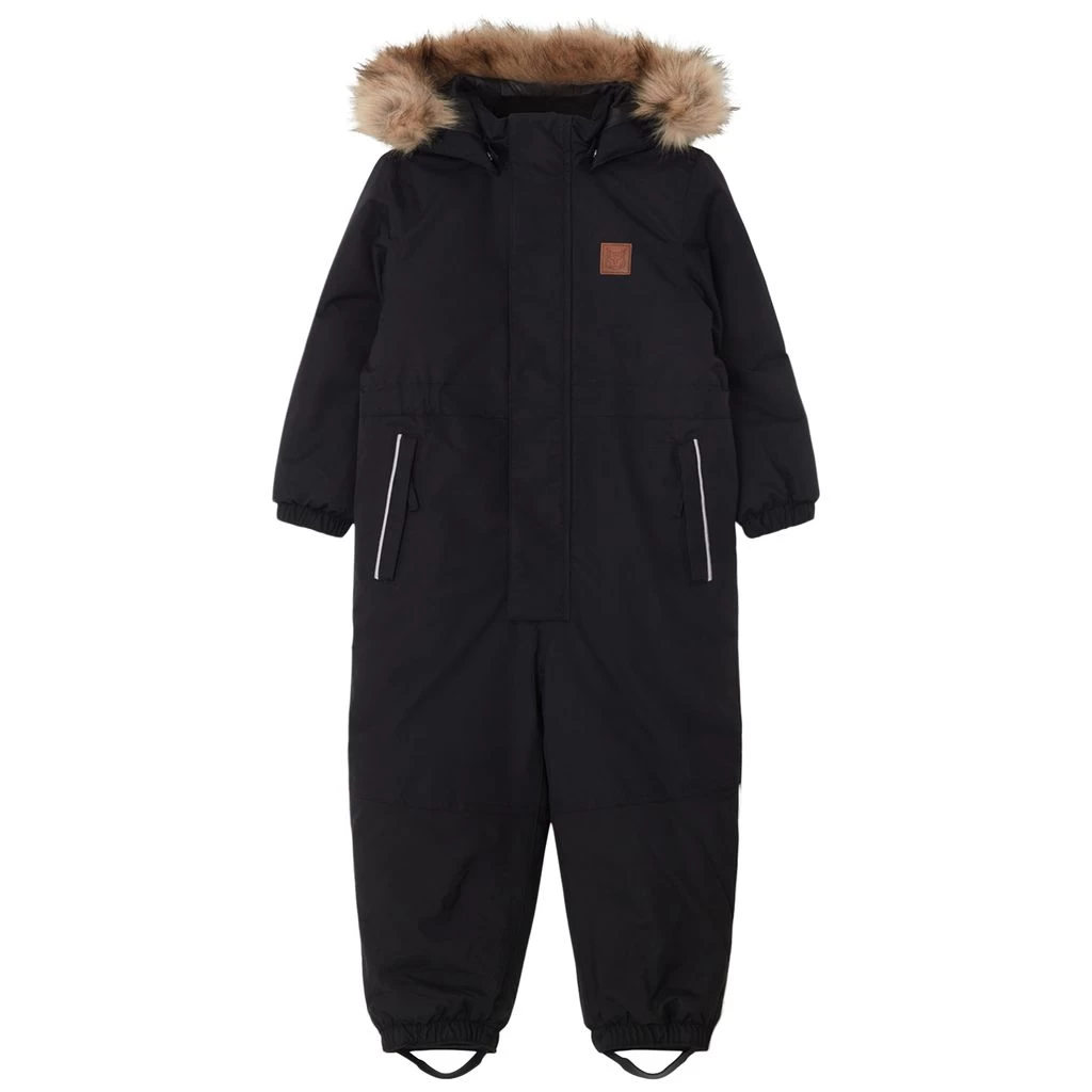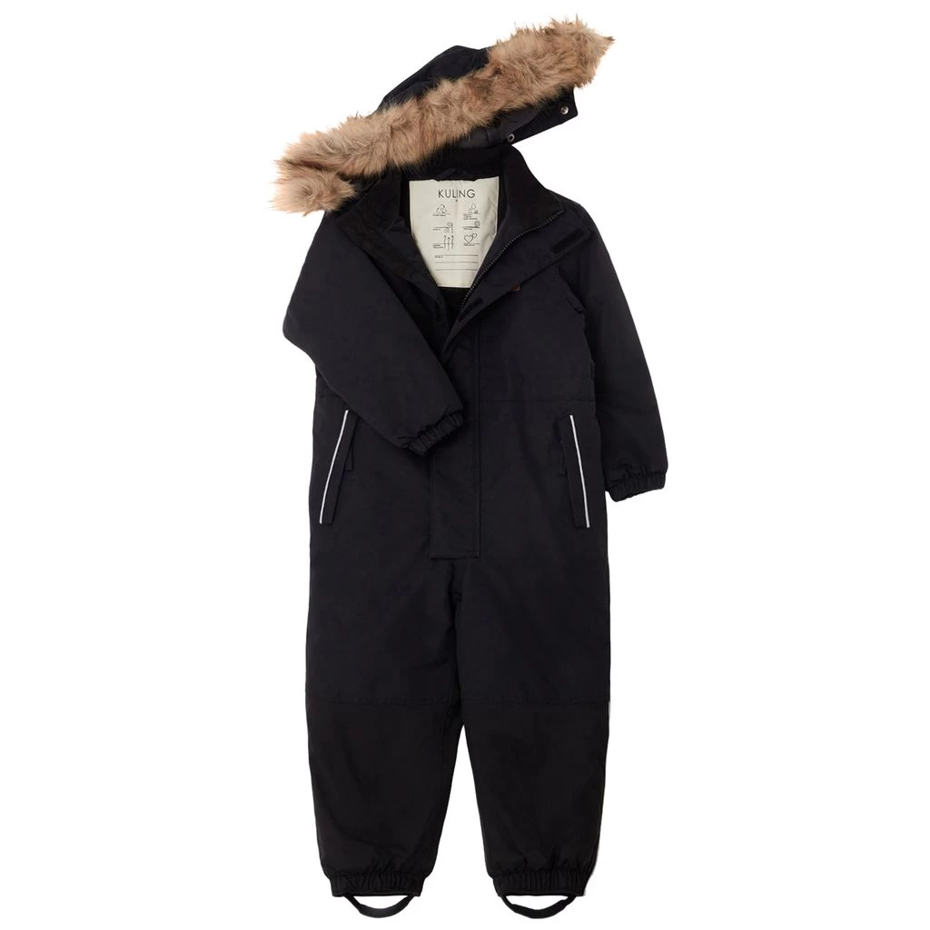 Be warm and comfy on winter adventures. Black Chamonix snowsuit by Kuling. The snowsuit has taped seams. It has warm padding, a detachable hood with detachable faux fur trim, a zip closure at the front, two front pockets, elasticated cuffs, a reinforcement at the seat and at the leg ends and detachable, adjustable silicone foot loops.