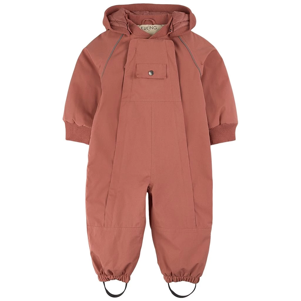 Pink Copenhagen coverall by Kuling. The coverall has taped seams. It has quilted padding, a detachable hood, double zip closures at the front, a chest pocket, ribbed cuffs, elasticated cuffs at the leg ends, detachable, adjustable silicone foot loops and reflective details for visibility.