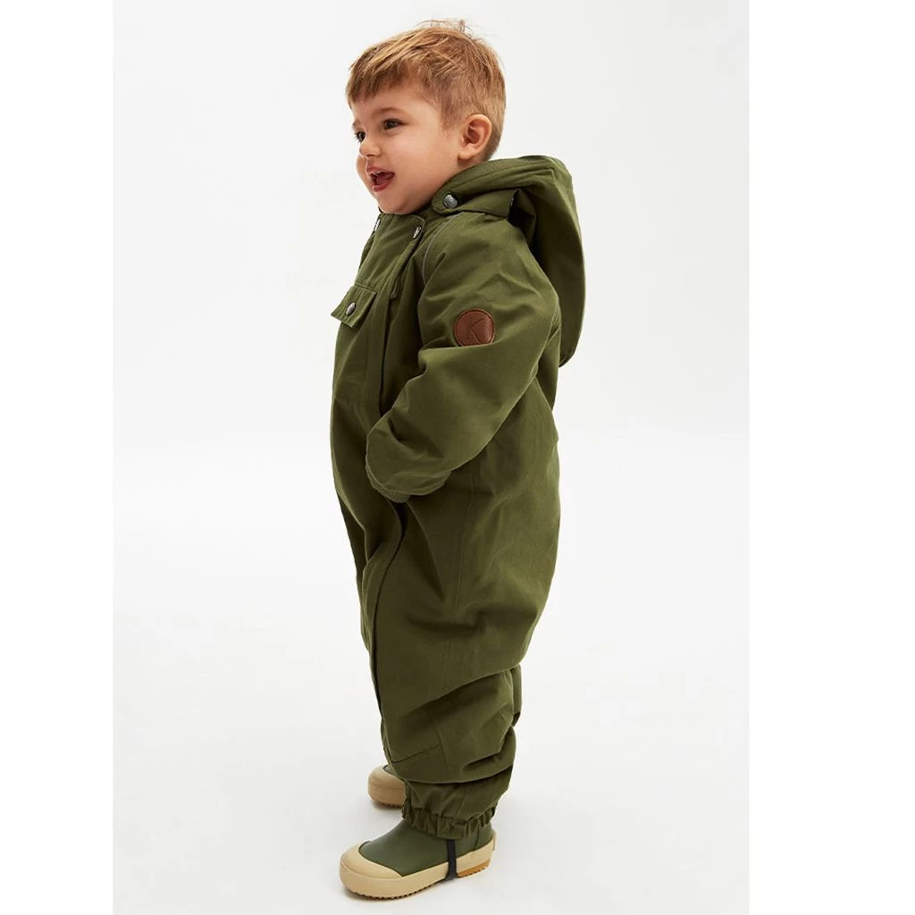 Green Copenhagen coverall by Kuling. The coverall has taped seams. It has quilted padding, a detachable hood, double zip closures at the front, a chest pocket, ribbed cuffs, elasticated cuffs at the leg ends, detachable, adjustable silicone foot loops and reflective details for visibility.