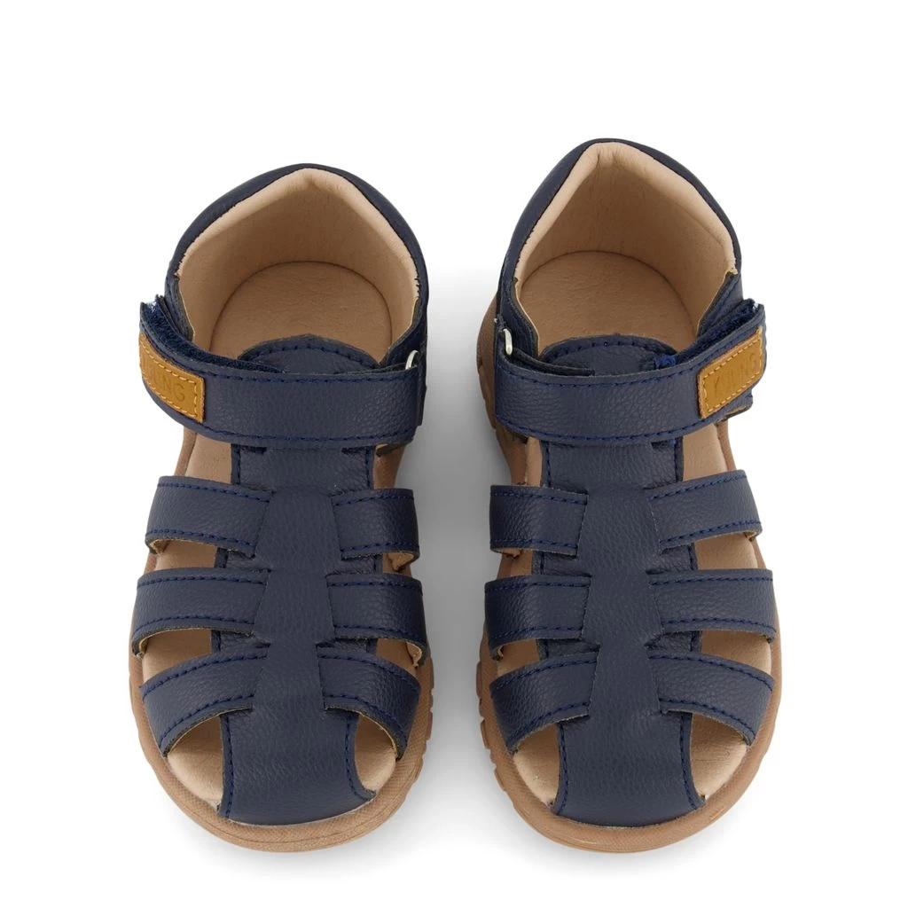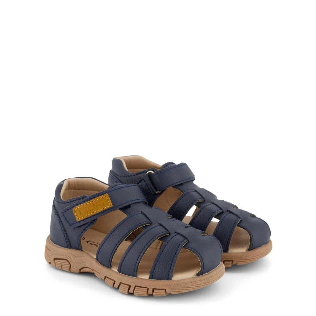Perfect for those sunny days. Navy Dili sandals by Kuling. The sandals have a faux leather upper. They have a closed toe, a velcro closure for easy on and off, a cushioned insole and a non-slip sole.