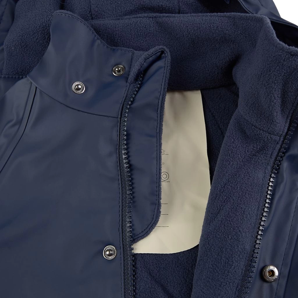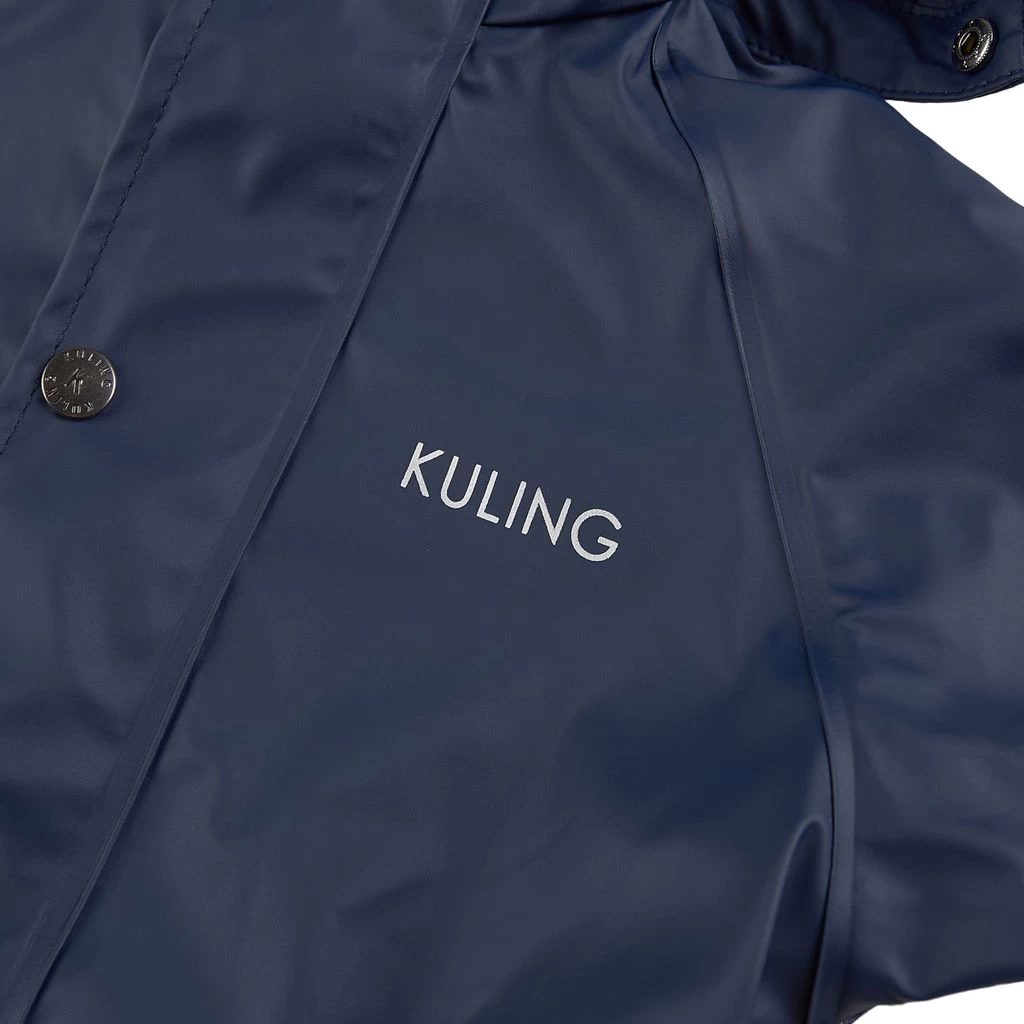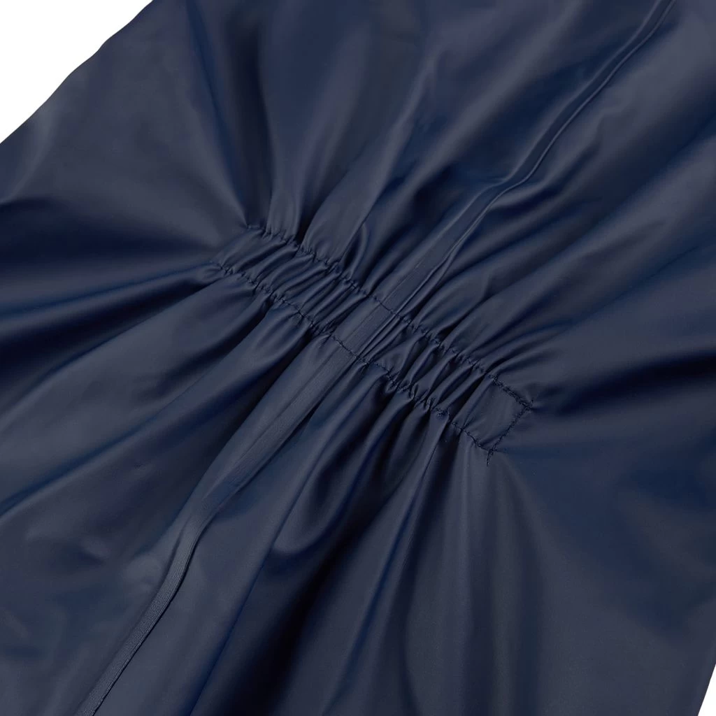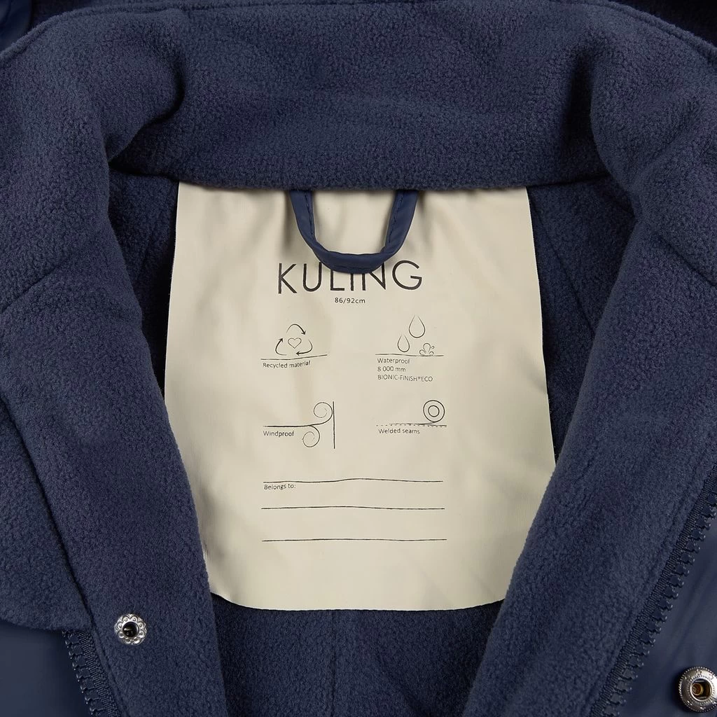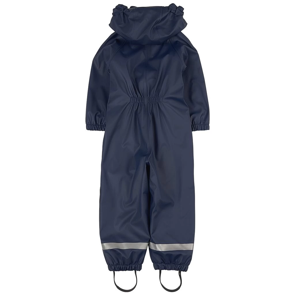 Time to jump through puddles. Navy Douglas rain coverall by Kuling. The coverall has welded seams. It has a soft fleece lining, a detachable hood, a zip closure at the front, elasticated cuffs, adjustable, detachable foot loops and reflective details for visibility.