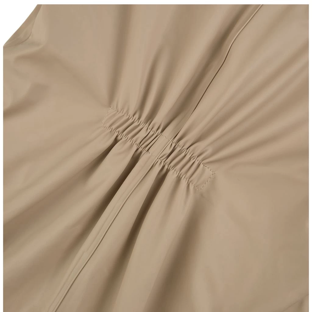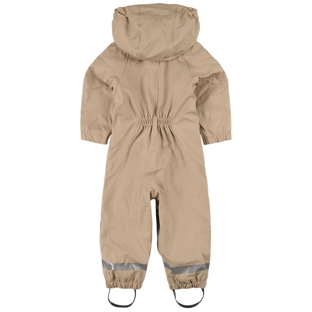 Sand Douglas rain coverall by Kuling. The coverall has welded seams. It has a soft fleece lining, a detachable hood, a YKK® zipper at the front, elasticated cuffs, reinforced knees, durable silicone foot loops and reflective details for visibility.