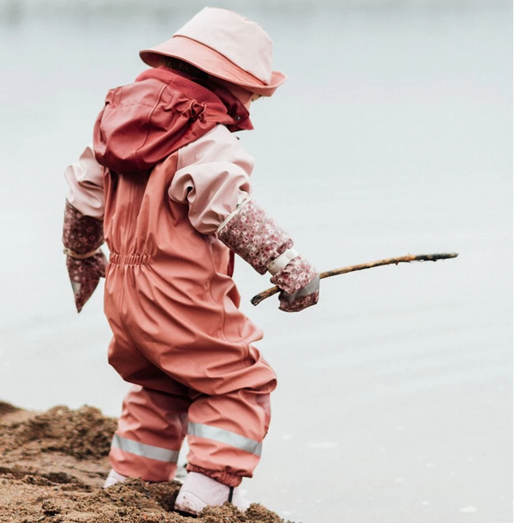 Time to jump through puddles. Pink Edinburgh rain coverall by Kuling. The coverall has welded seams. It has a soft fleece lining, a detachable hood, a zip closure at the front, elasticated cuffs, adjustable, detachable foot loops and reflective details for visibility.