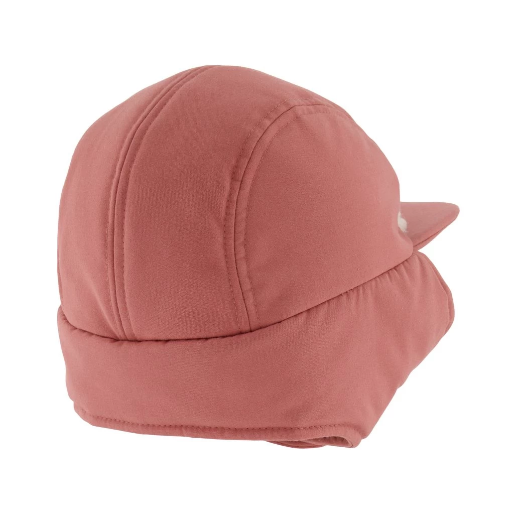 Keep little heads warm. Pink Edmonton shell cap by Kuling. The shell cap has light padding. It has a flat bill, ear flaps with velcro closure at the chin and a teddy fleece at the front.