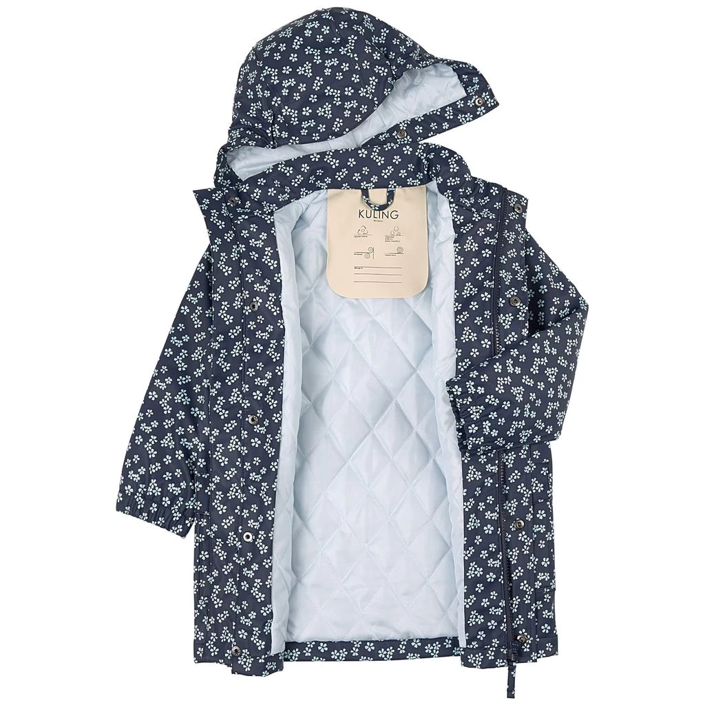 Rainy days won’t stand a chance. Navy Faro raincoat by Kuling. The jacket has welded seams. It has a quilted lining, a detachable hood, a zip closure at the front, elasticated cuffs and two front pockets.