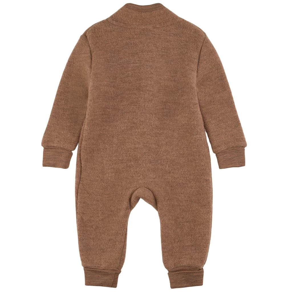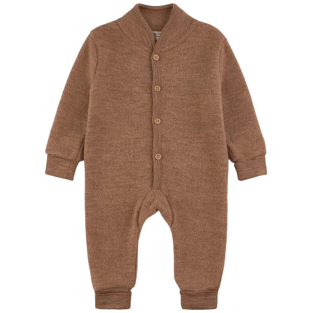 Wool brings you warmth and comfort. Brown fleece onesie by Kuling. The fleece onesie has a button closure at the front. It has foldable cuffs at the leg ends.
