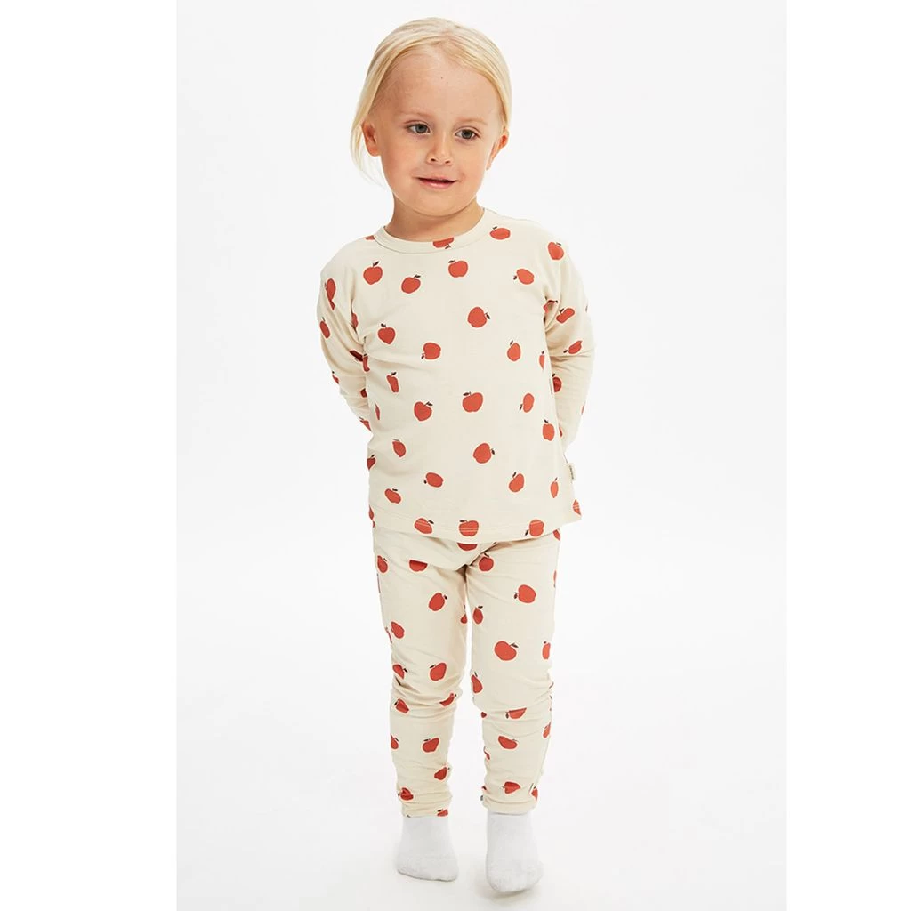 Be eco-friendly and feel amazing in these leggings. White GOTS Serrai leggings by Kuling. The leggings have an all-over print with apples. They have an elasticated waist.