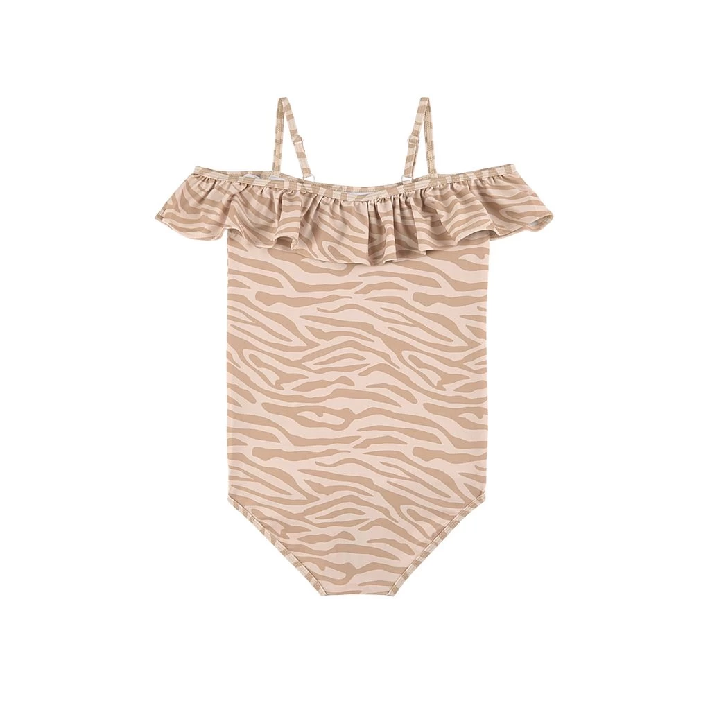 Time to go for a swim. Sand Grace Bay swimsuit by Kuling. The swimsuit has a quick dry, stretchy material. It has an off shoulder look with ruffle detailing, spaghetti straps with bows and a lined front.