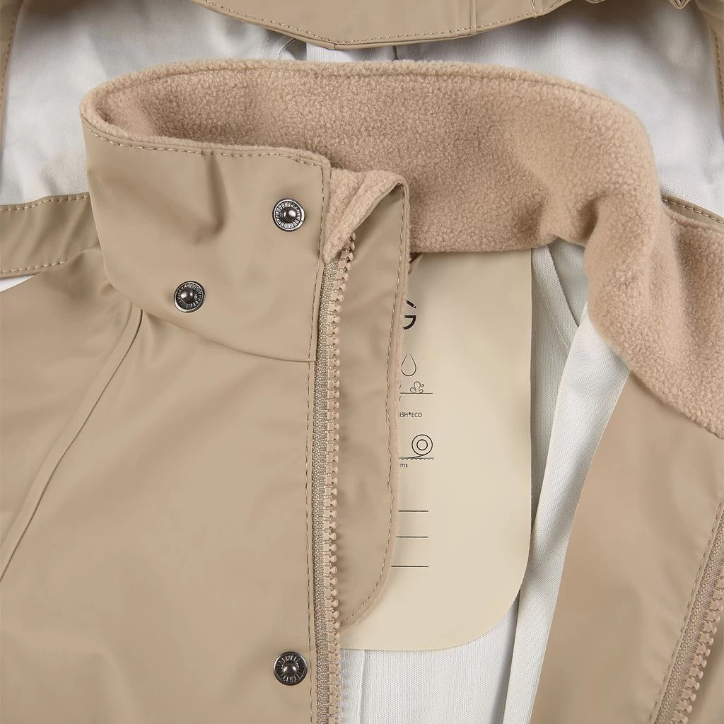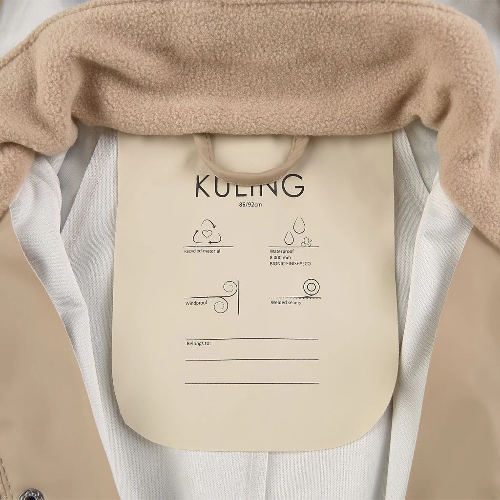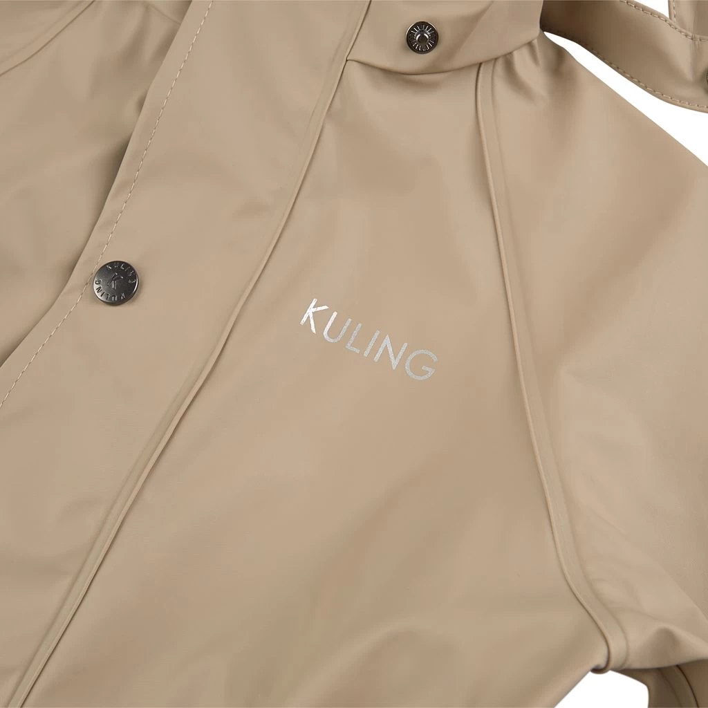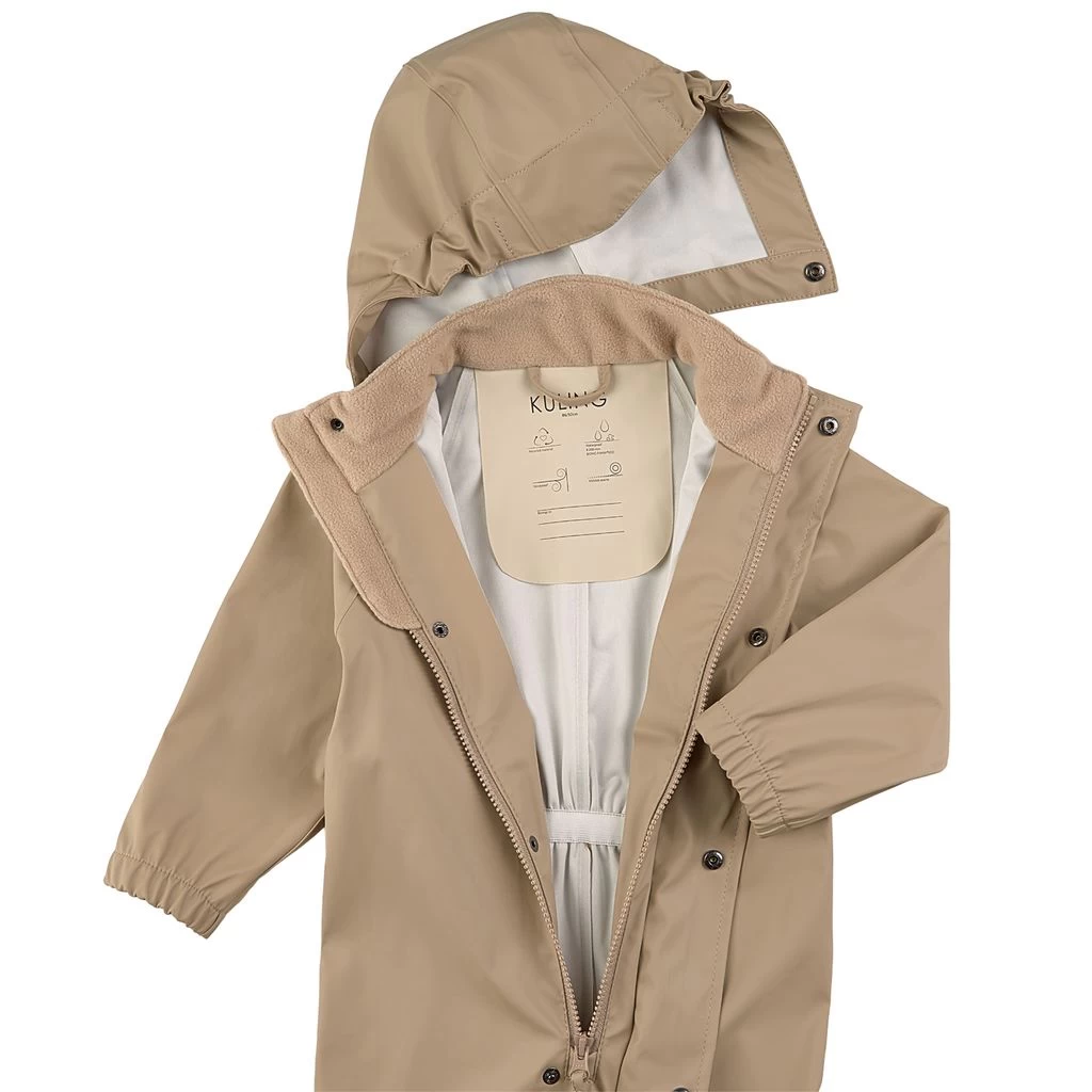 Rainy days won’t stand a chance. Beige Leeds rain coverall by Kuling. The coverall has welded seams. It has a detachable hood, a zip closure at the front, elasticated cuffs, detachable, adjustable foot loops and reflective details for visibility.