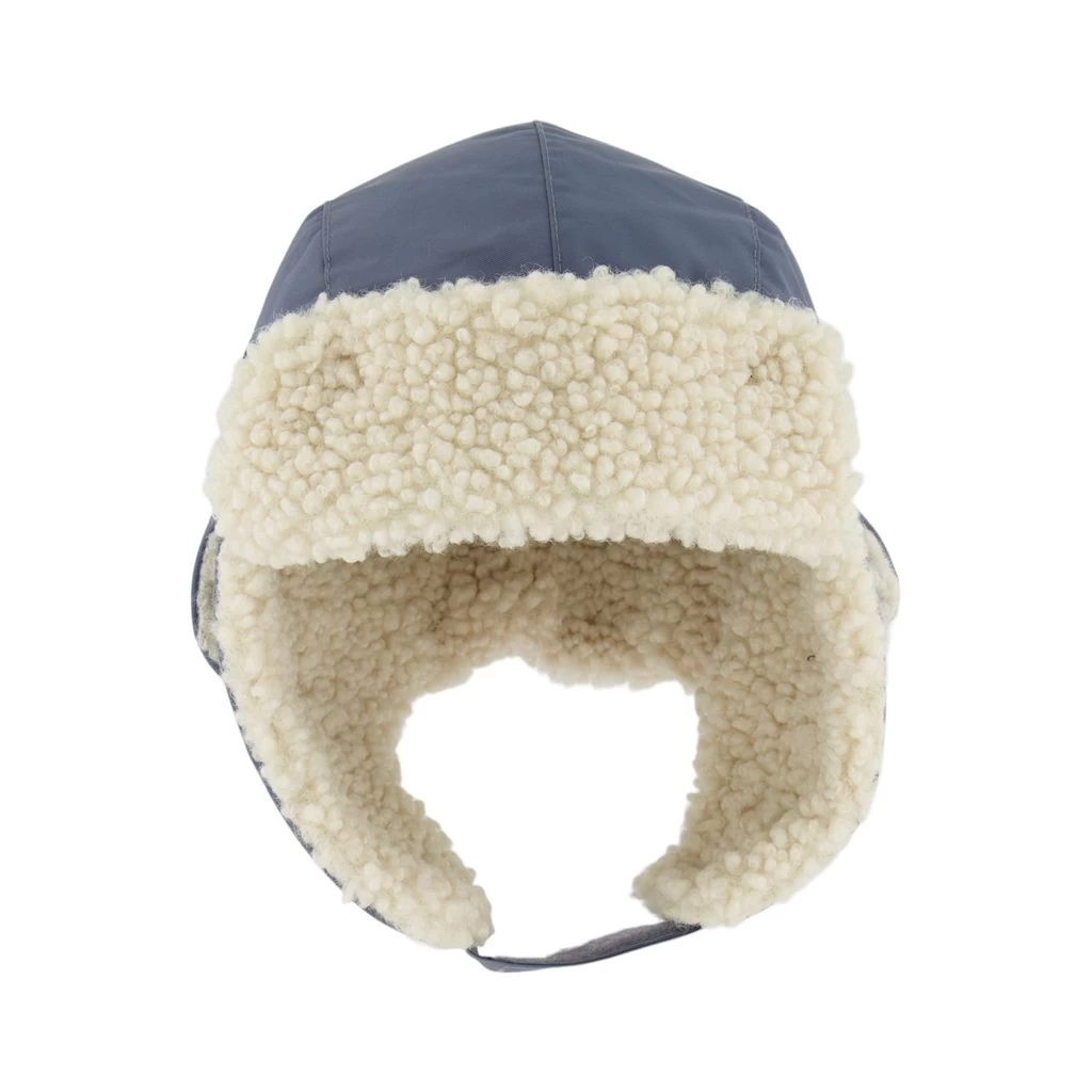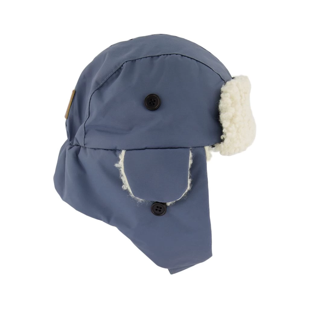 Blue Levi trapper hat by Kuling. The trapper hat has taped seams. It has soft teddy fleece lining and a velcro closure at the chin.