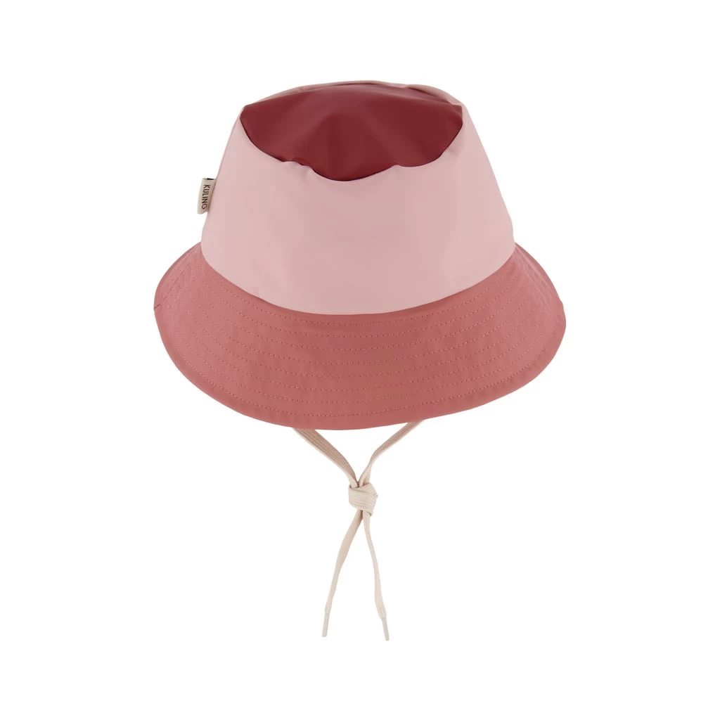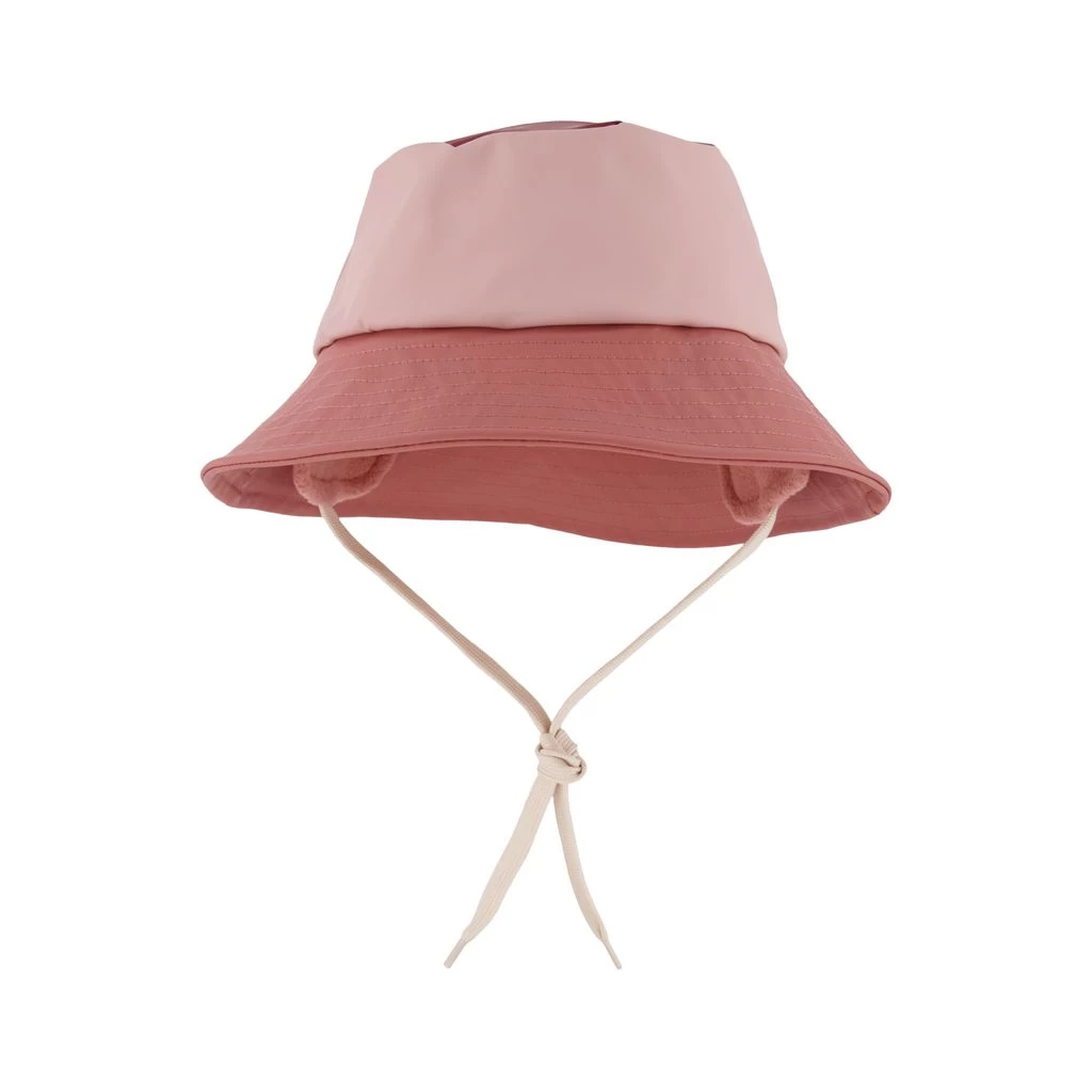 Pink Liverpool rain hat by Kuling. The rain hat has welded seams. It has a slim brim, fleece lined ear flaps and tie strings at the chin.