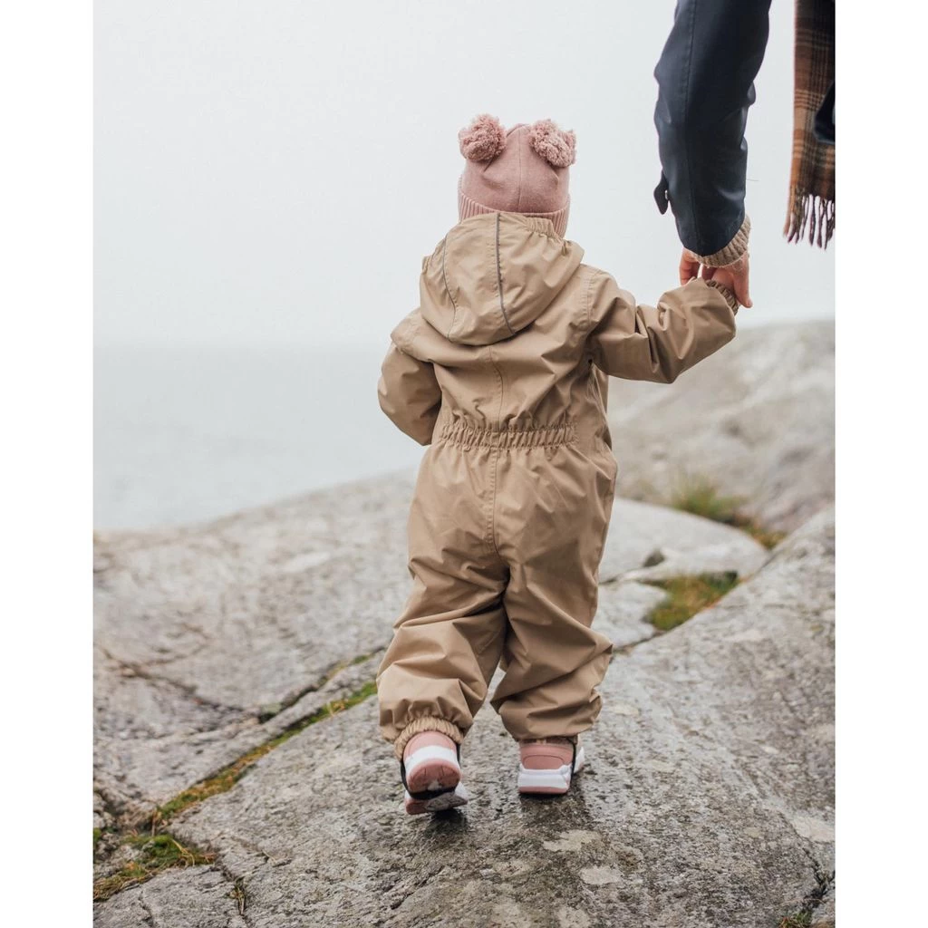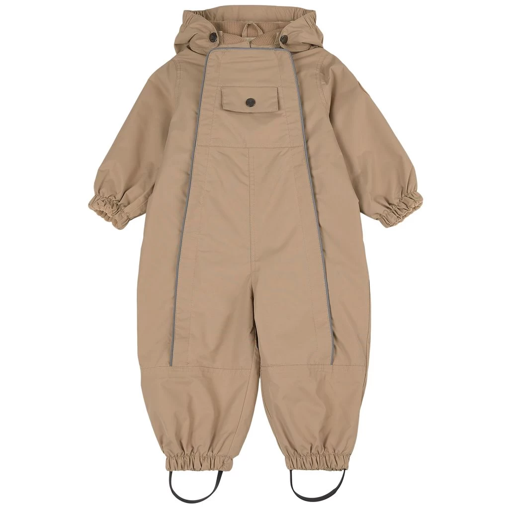 Get ready for outdoor adventures. Beige Milano shell coverall by Kuling. The shell coverall has taped seams. It has YKK® zippers at the front, a detachable hood, a chest pocket, elasticated cuffs, adjustable, detachable silicone foot loops and reflective details for visibility.