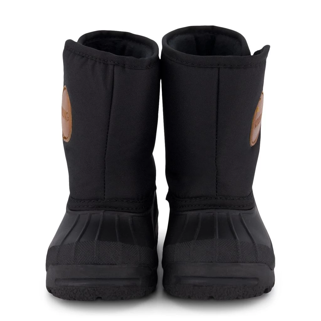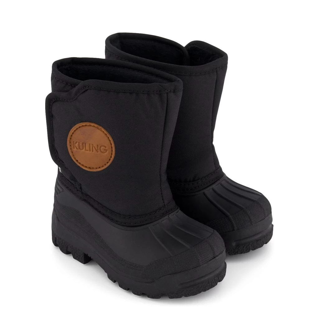 Black Minnesota winter boots by Kuling. The winter boots have padding for warmth. They have a velcro closure for easy on and off, a TPR sole with rough tread for a sure step and a reflective detail for visibility.