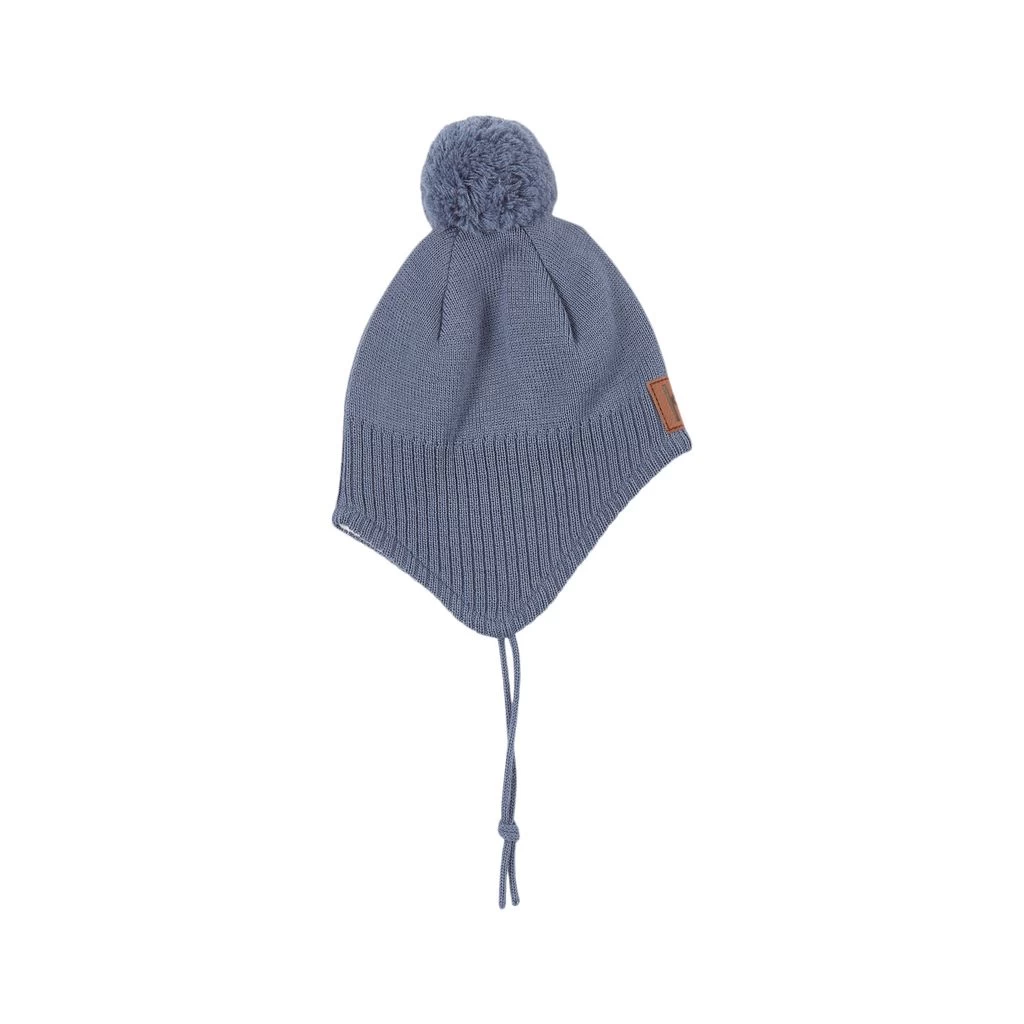 Blue Narvik beanie by Kuling. The hat has a warm fleece lining. It has tie strings at the chin and a pom-pom at the top.