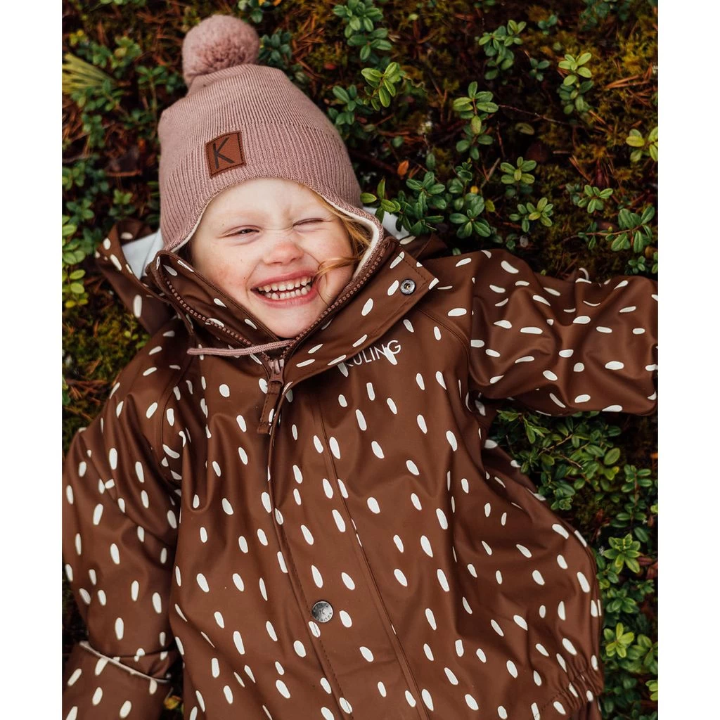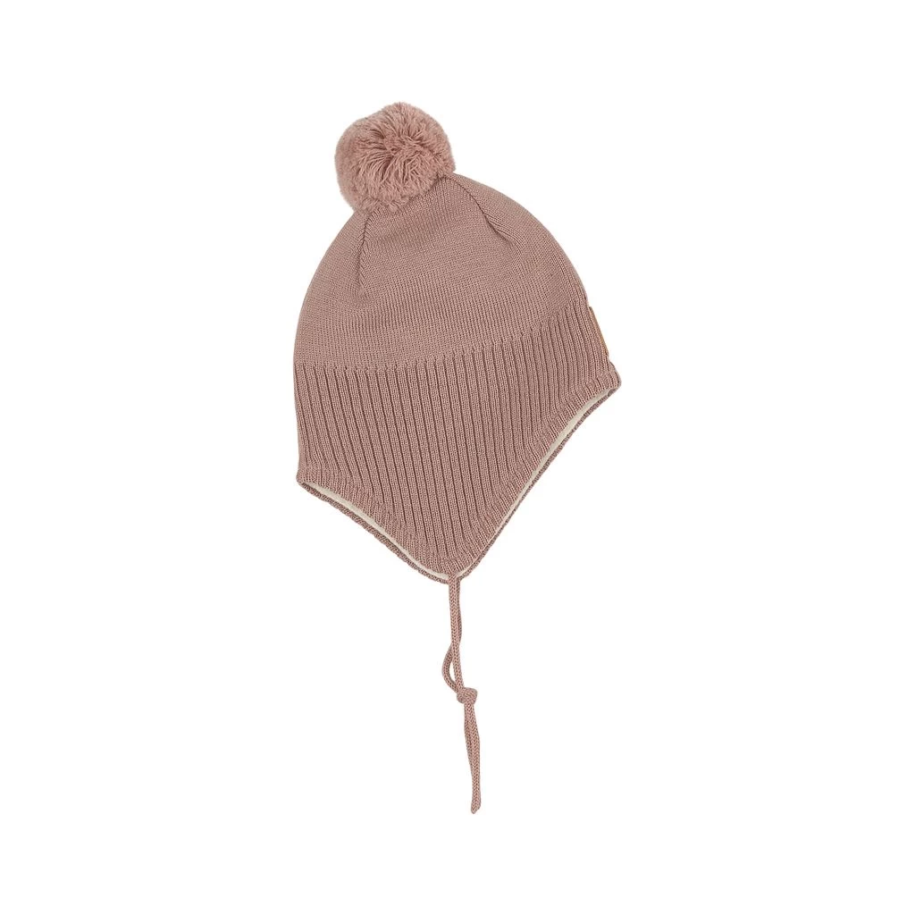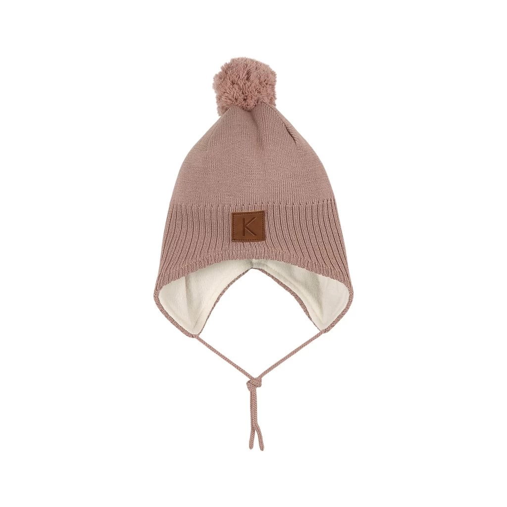 Keep little ears warm in style. Pink Narvik beanie by Kuling. The hat has a knitted design. It has a double, soft fleece lining, a pom-pom at the top, ear flaps and tie strings at the chin.