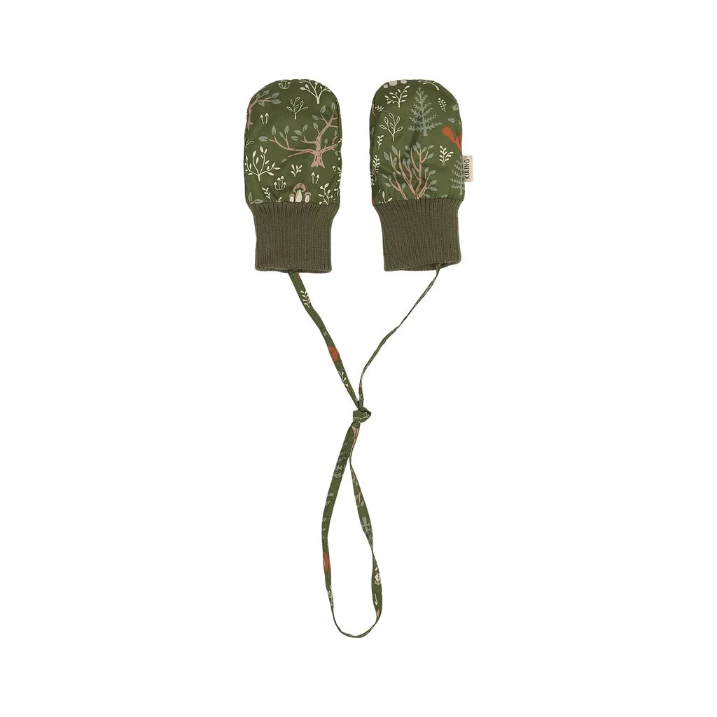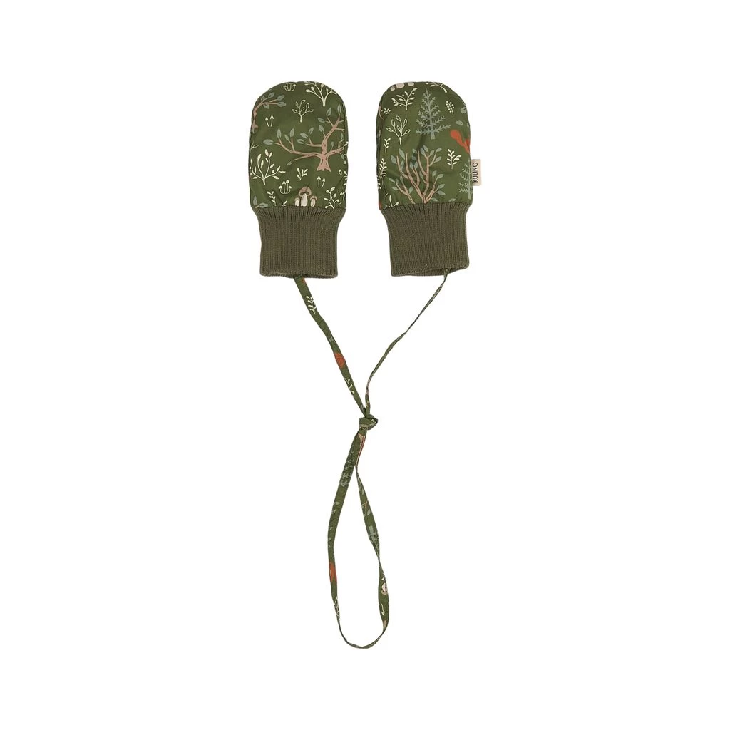 Keep little hands warm. Green New Haven mittens by Kuling. The mittens have ribbed cuffs. They have a string keeps the mittens in place.