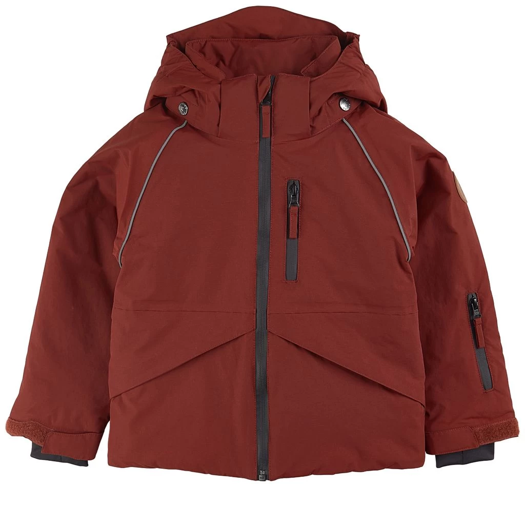 Burgundy Niseko ski jacket by Kuling. The jacket has taped seams. It has warm padding, a detachable hood, a zip closure at the front, three front pockets, a ski pass pocket on the sleeve, adjustable cuffs with a lycra inner cuff, a snow gaiter at the hem and reflective details for visibility.