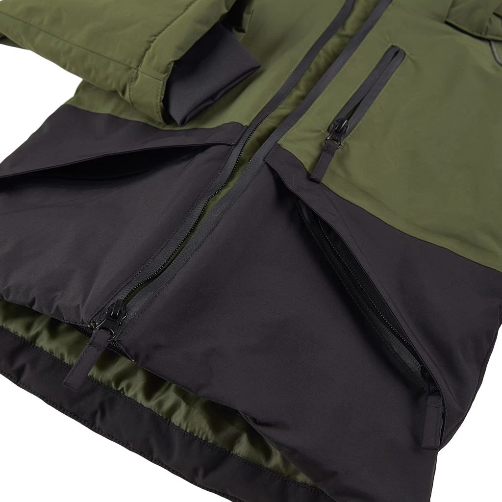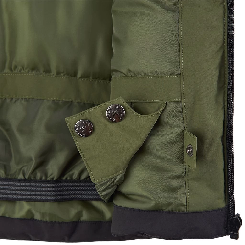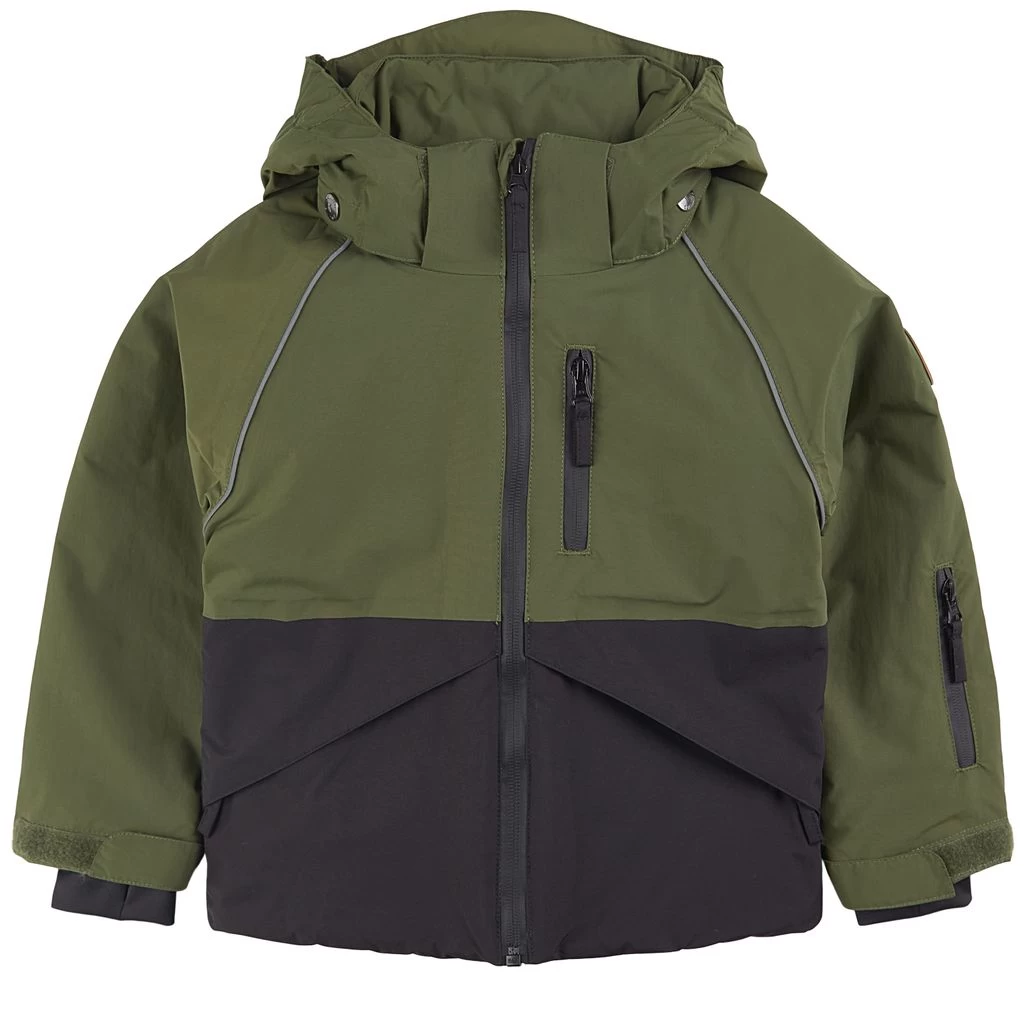 Moss green Niseko ski jacket by Kuling. The jacket has taped seams. It has warm padding, a detachable hood, a zip closure at the front, three front pockets, a ski pass pocket on the sleeve, adjustable cuffs with a lycra inner cuff, a snow gaiter at the hem and reflective details for visibility.