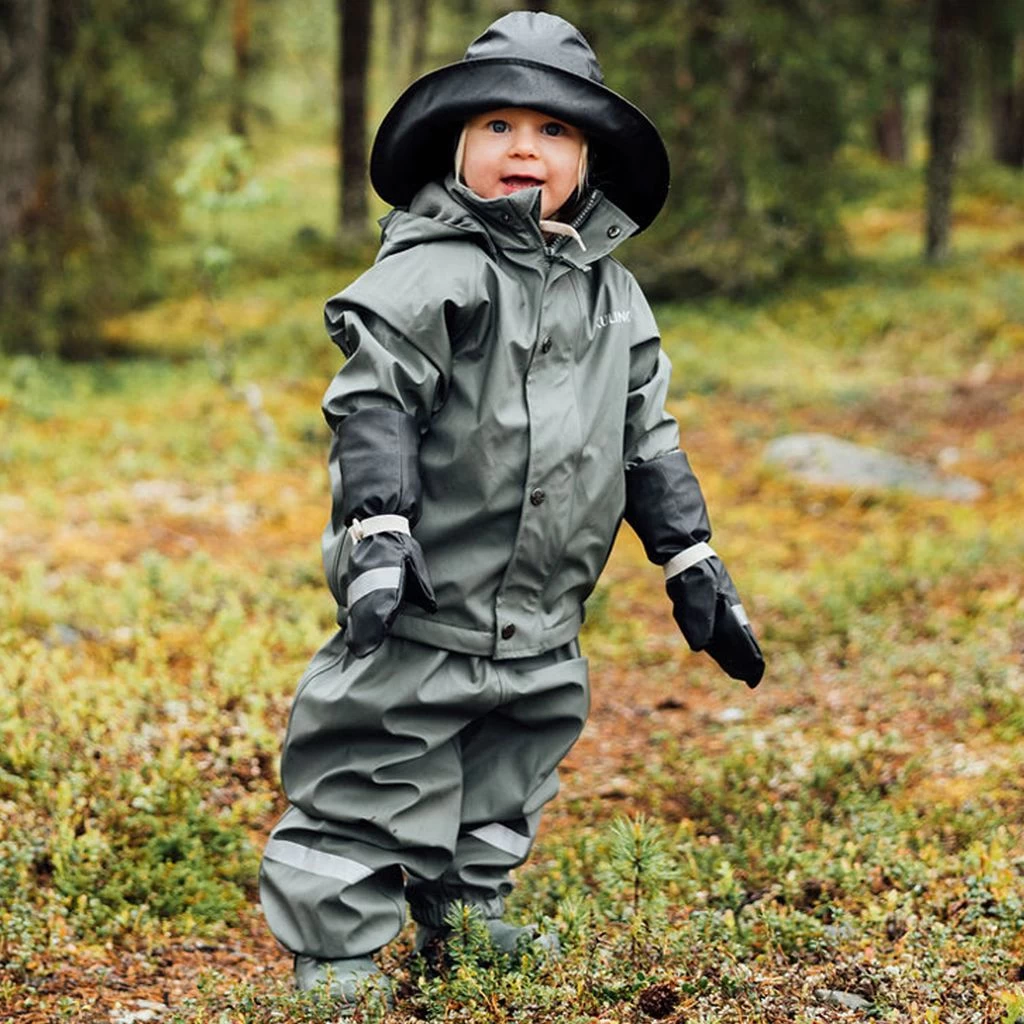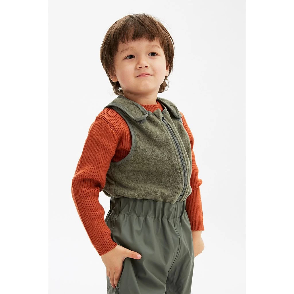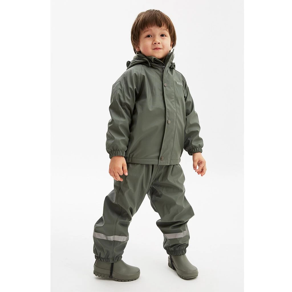 Light green Ottawa rain set by Kuling. The set has welded seams. It has a fleece lining, reflective details for visibility, pants with a bodice in fleece, a velcro closure at the shoulders, a YKK® zipper at the front, an elasticated waist and durable, adjustable silicone foot loops and a jacket with a detachable hood, a YKK® zipper at the front and elasticated cuffs.