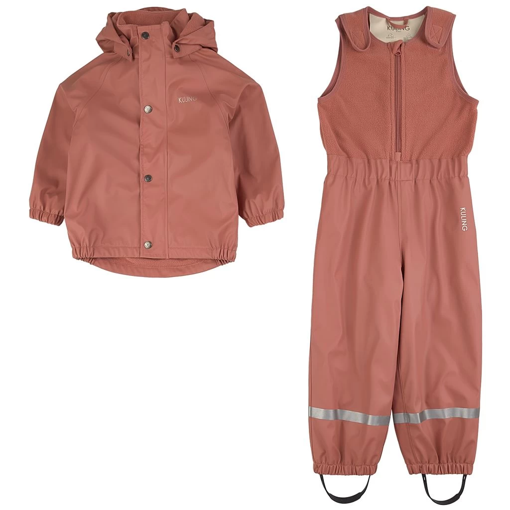 Time to jump through puddles. Pink Ottawa rain set by Kuling. The set has welded seams. It has a soft fleece lining, a jacket with a detachable hood, a YKK® zipper at the front and elasticated cuffs, pants with a fleece bodice, velcro closure at the shoulders, a YKK® zipper at the front, an elasticated waist and durable, adjustable silicone foot loops and reflective details for visibility.