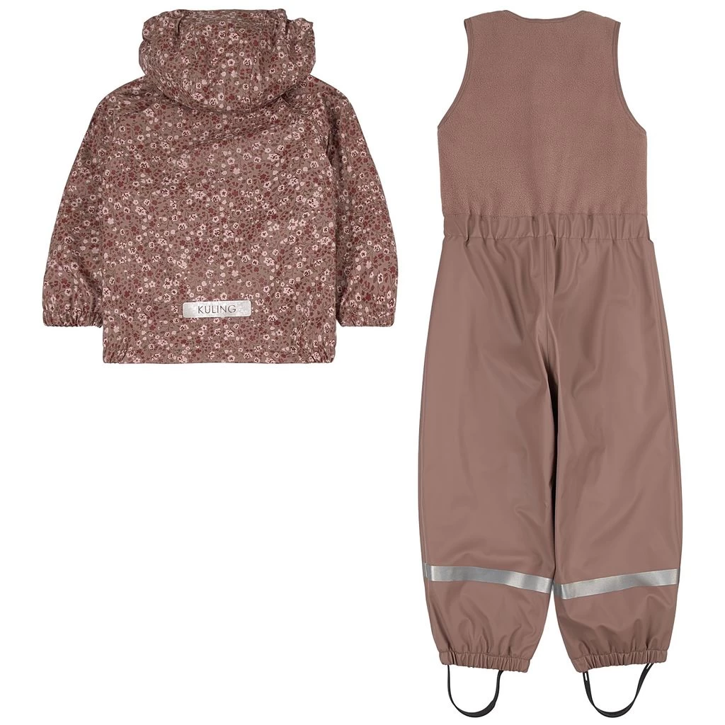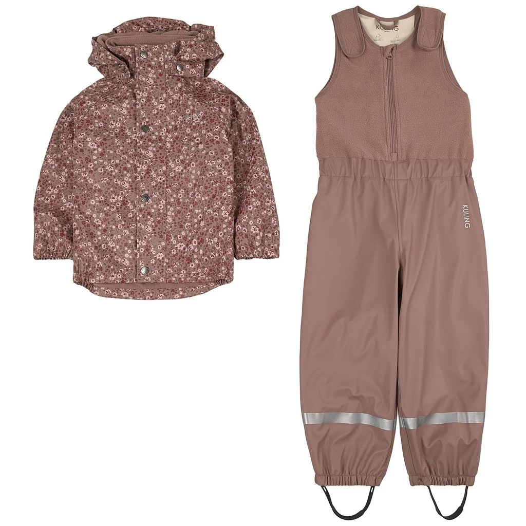 Time to jump through puddles. Ottawa rain set by Kuling. The set has welded seams. It has a soft fleece lining, a jacket with a detachable hood, a YKK® zipper at the front and elasticated cuffs, pants with a fleece bodice, velcro closure at the shoulders, a YKK® zipper at the front, an elasticated waist and durable, adjustable silicone foot loops and reflective details for visibility.