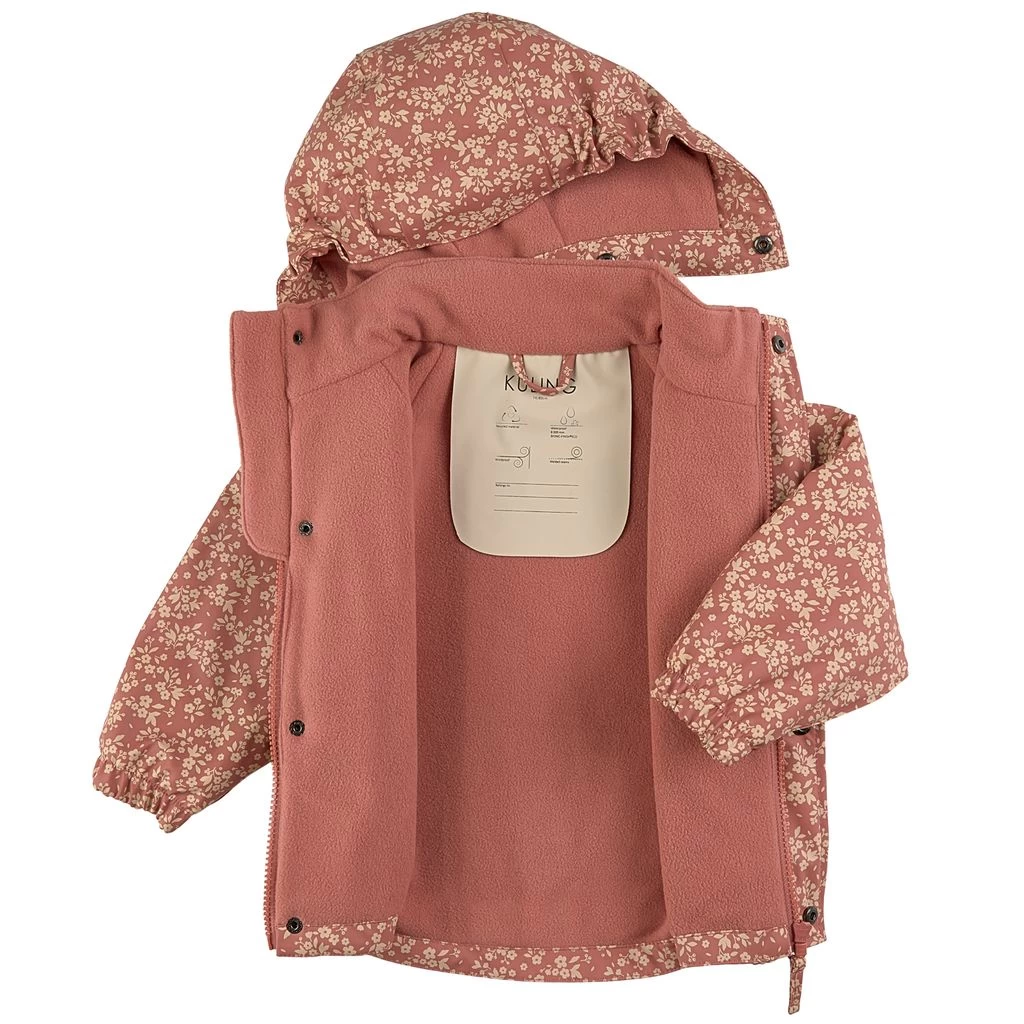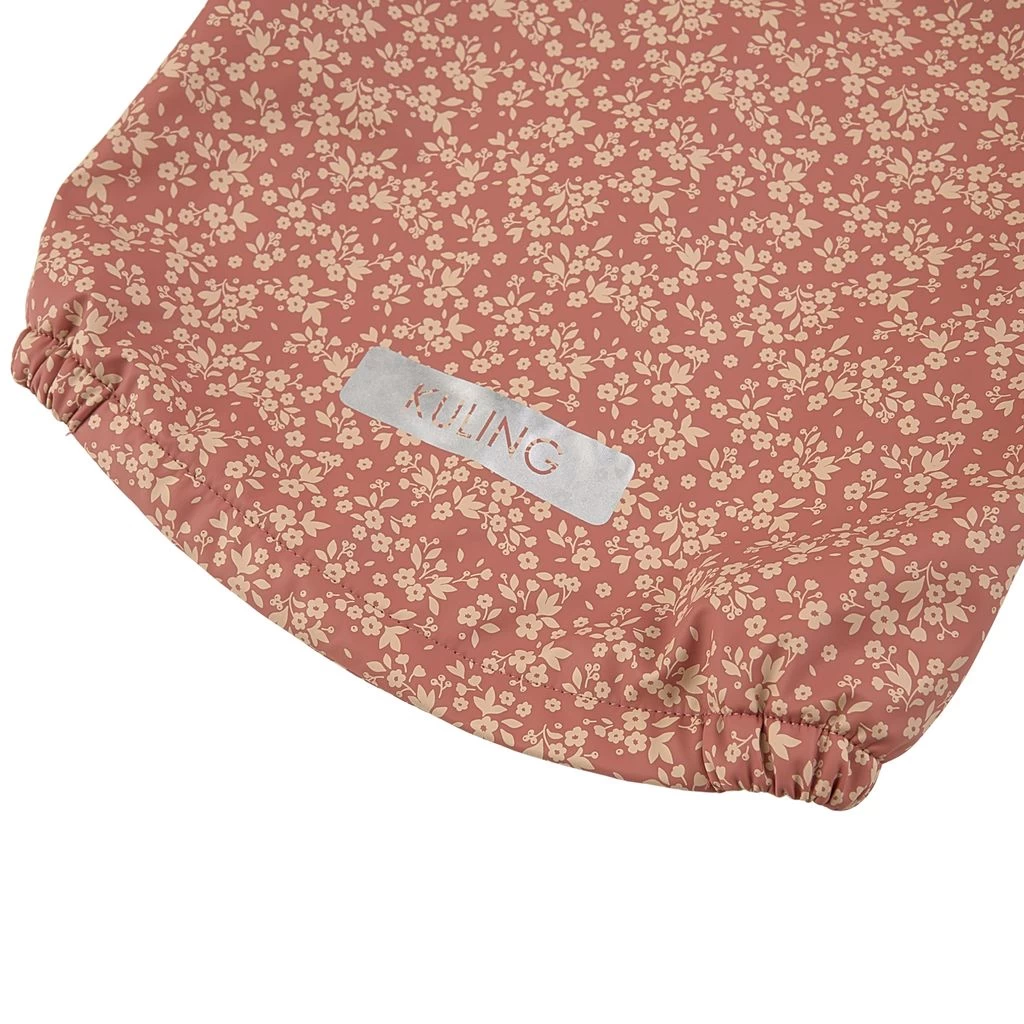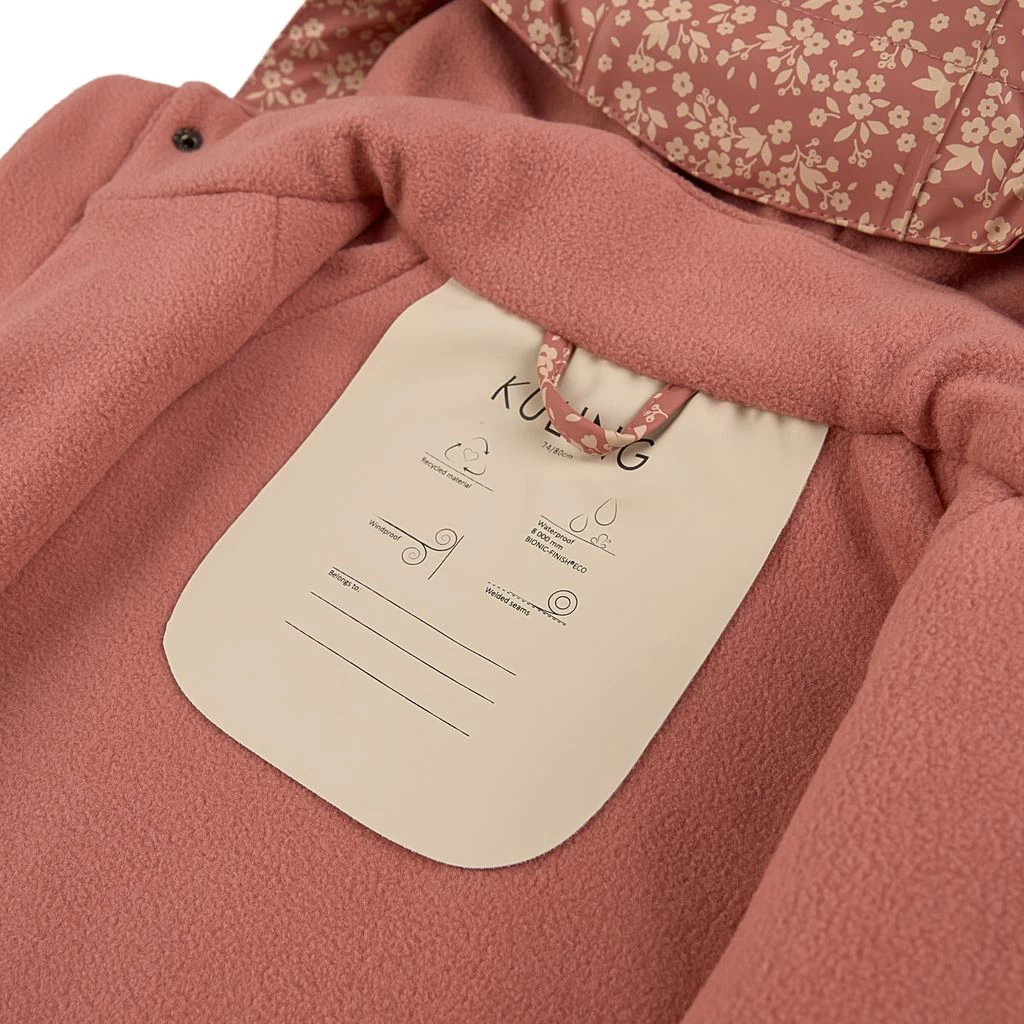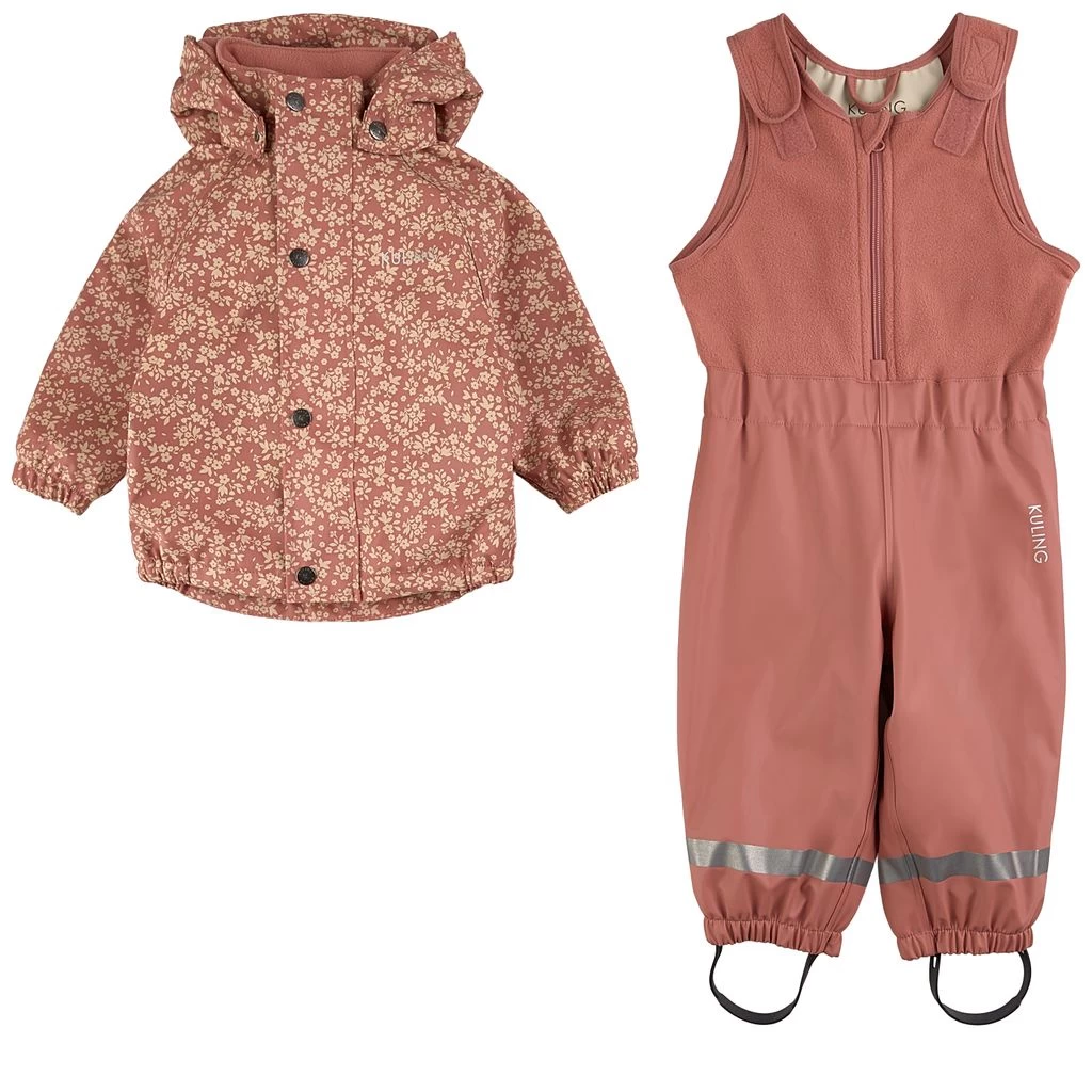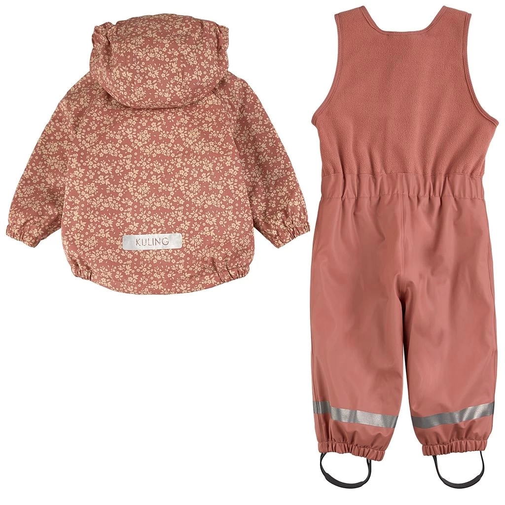 Time to jump through puddles. Pink Ottawa rain set by Kuling. The set has welded seams. It has a soft fleece lining, a jacket with a detachable hood, a YKK® zipper at the front and elasticated cuffs, pants with a fleece bodice, velcro closure at the shoulders, a YKK® zipper at the front, an elasticated waist and durable, adjustable silicone foot loops and reflective details for visibility.
