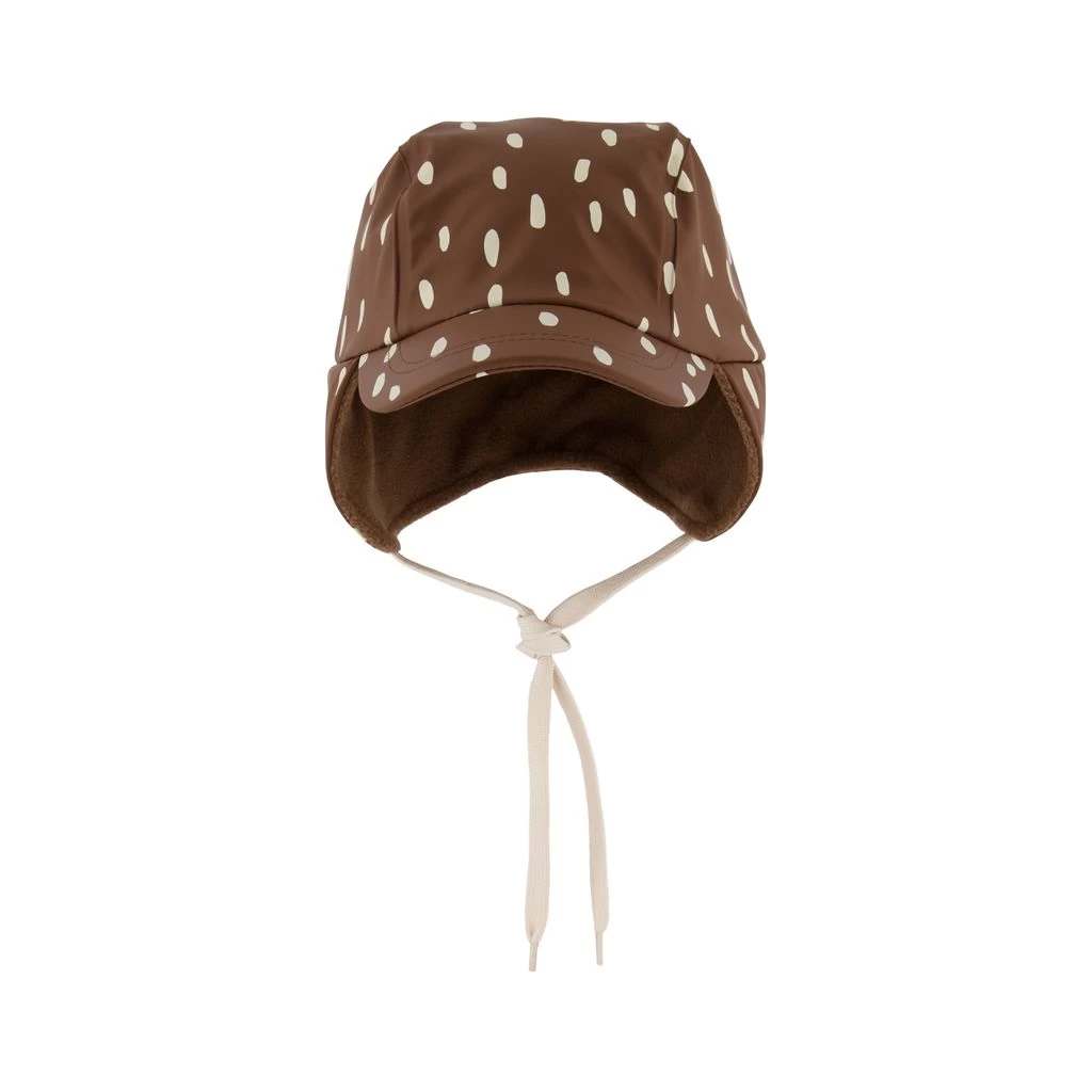 Brown Reykjavik rain cap by Kuling. The rain cap has welded seams. It has a curved bill, fleece lined ear flaps and tie straps at the chin.