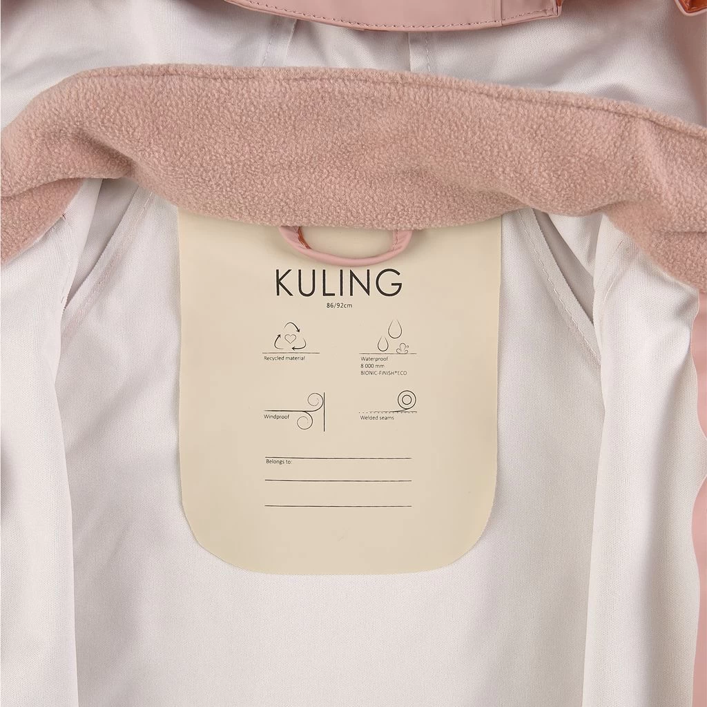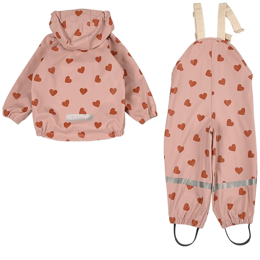 Time to jump through puddles. Pink San Marino rain set by Kuling. The set has welded seams. It has a jacket with a detachable hood, a zip closure at the front and elasticated cuffs, trousers with adjustable, elasticated shoulder straps, snap buttons at the sides, a front pocket, elasticated cuffs and adjustable, detachable foot loops and reflective details for visibility.