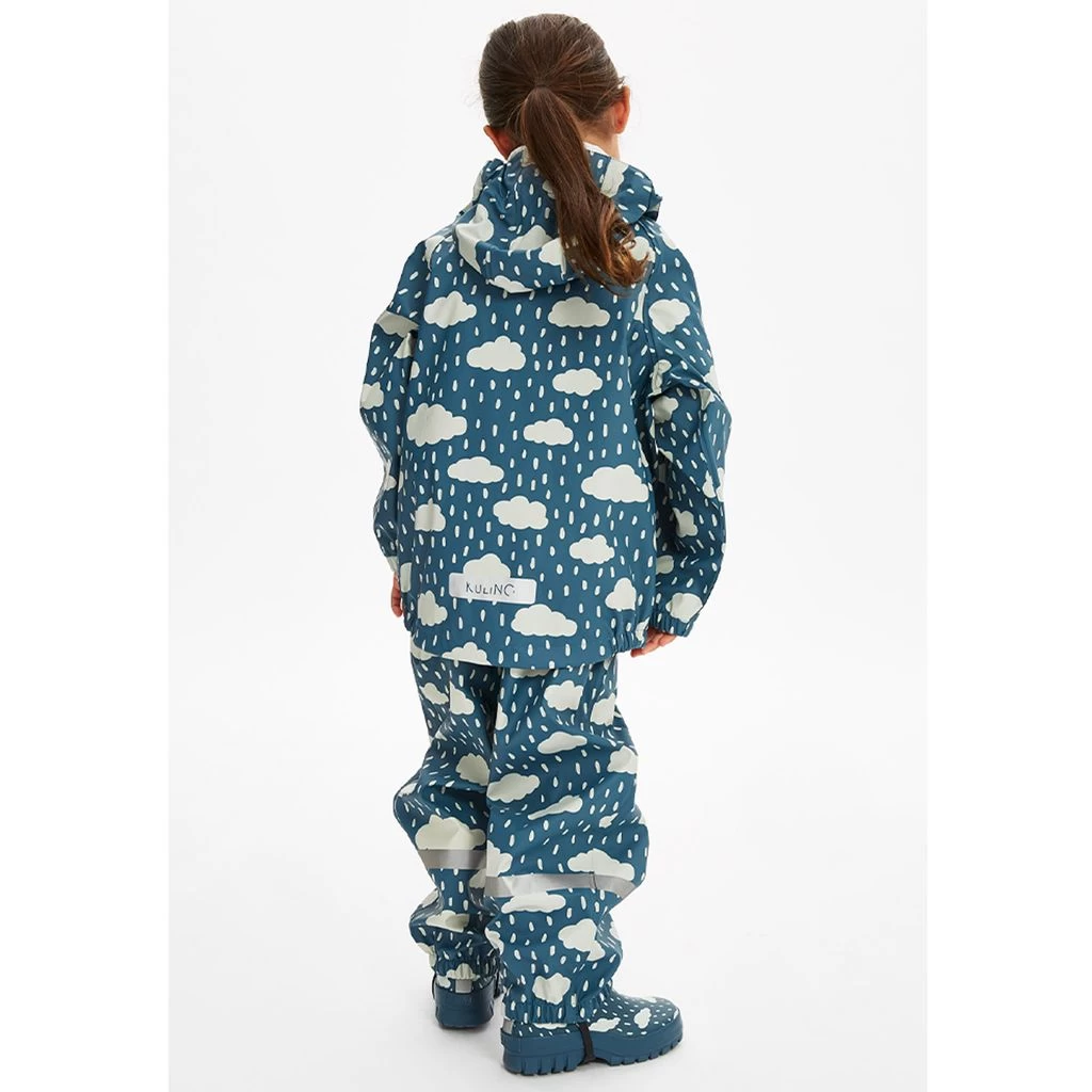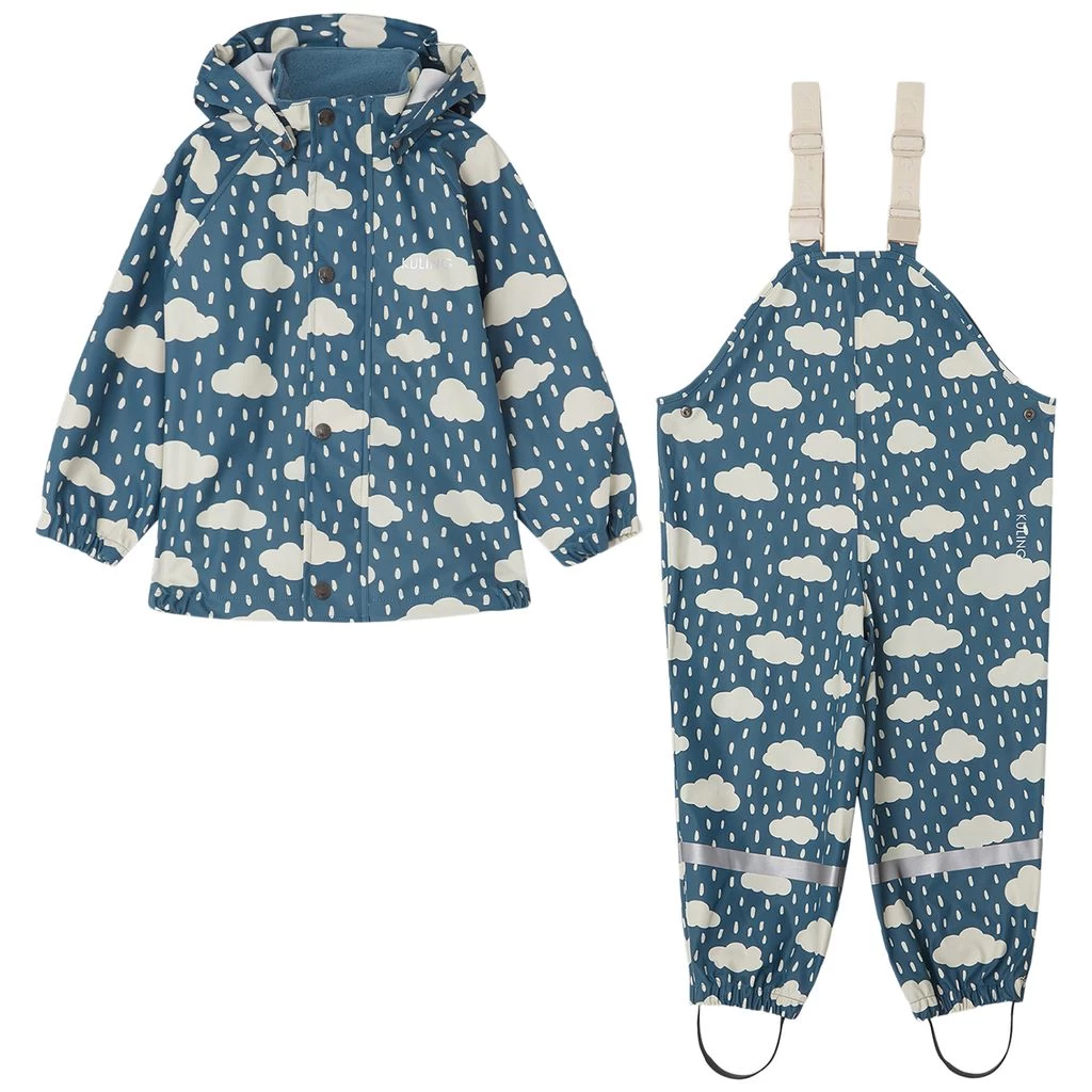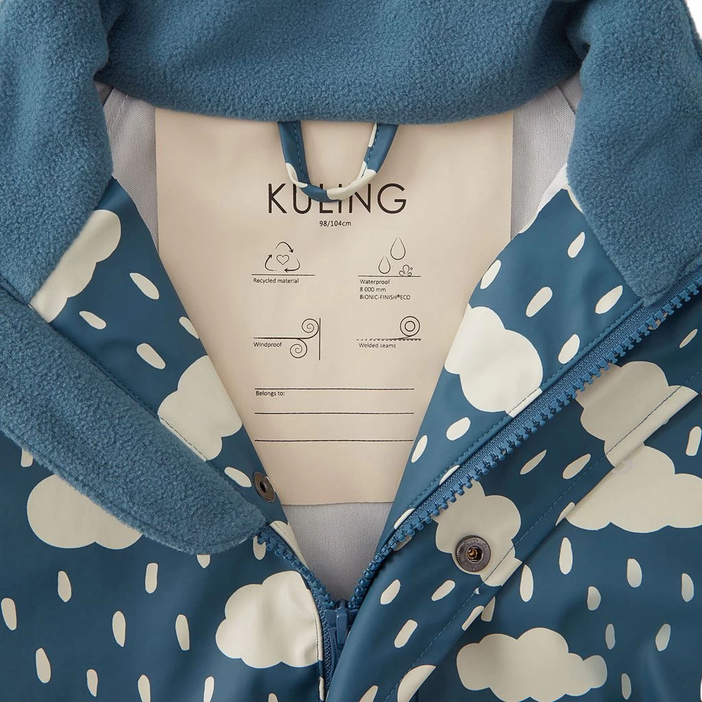 Time to jump through puddles. Blue San Marino rain set by Kuling. The set has welded seams. It has a jacket with a detachable hood, a zip closure at the front and elasticated cuffs, trousers with adjustable, elasticated shoulder straps, snap buttons at the sides, a front pocket, elasticated cuffs and adjustable, detachable foot loops and reflective details for visibility.