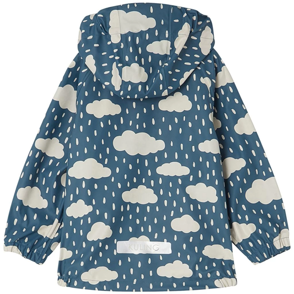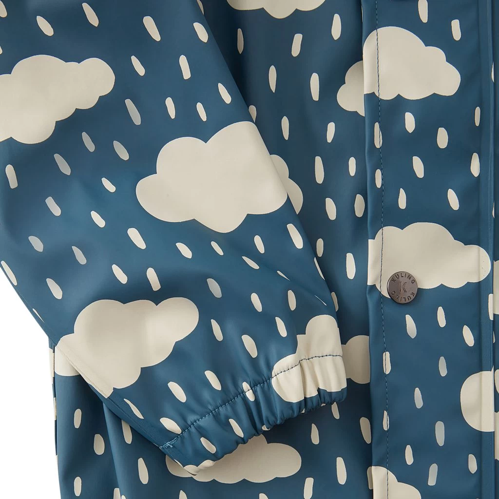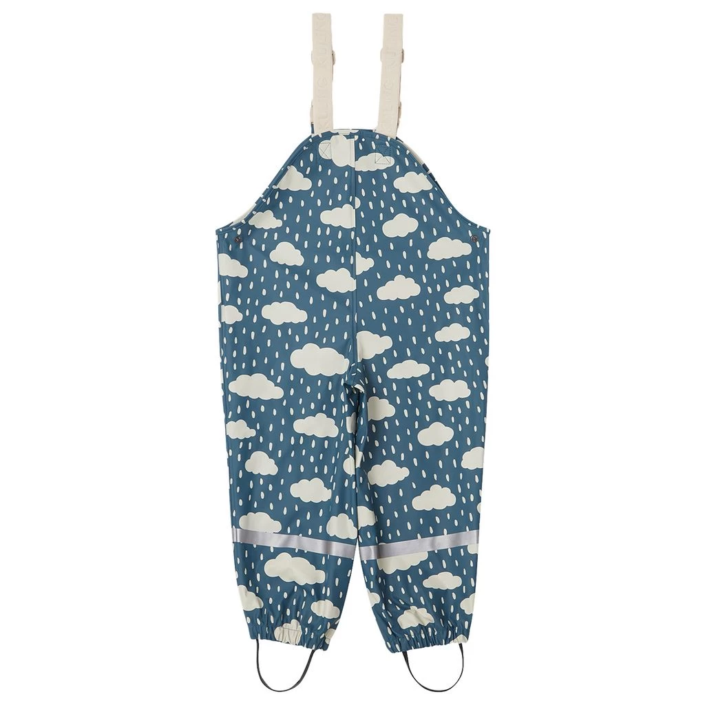 Time to jump through puddles. Blue San Marino rain set by Kuling. The set has welded seams. It has a jacket with a detachable hood, a zip closure at the front and elasticated cuffs, trousers with adjustable, elasticated shoulder straps, snap buttons at the sides, a front pocket, elasticated cuffs and adjustable, detachable foot loops and reflective details for visibility.