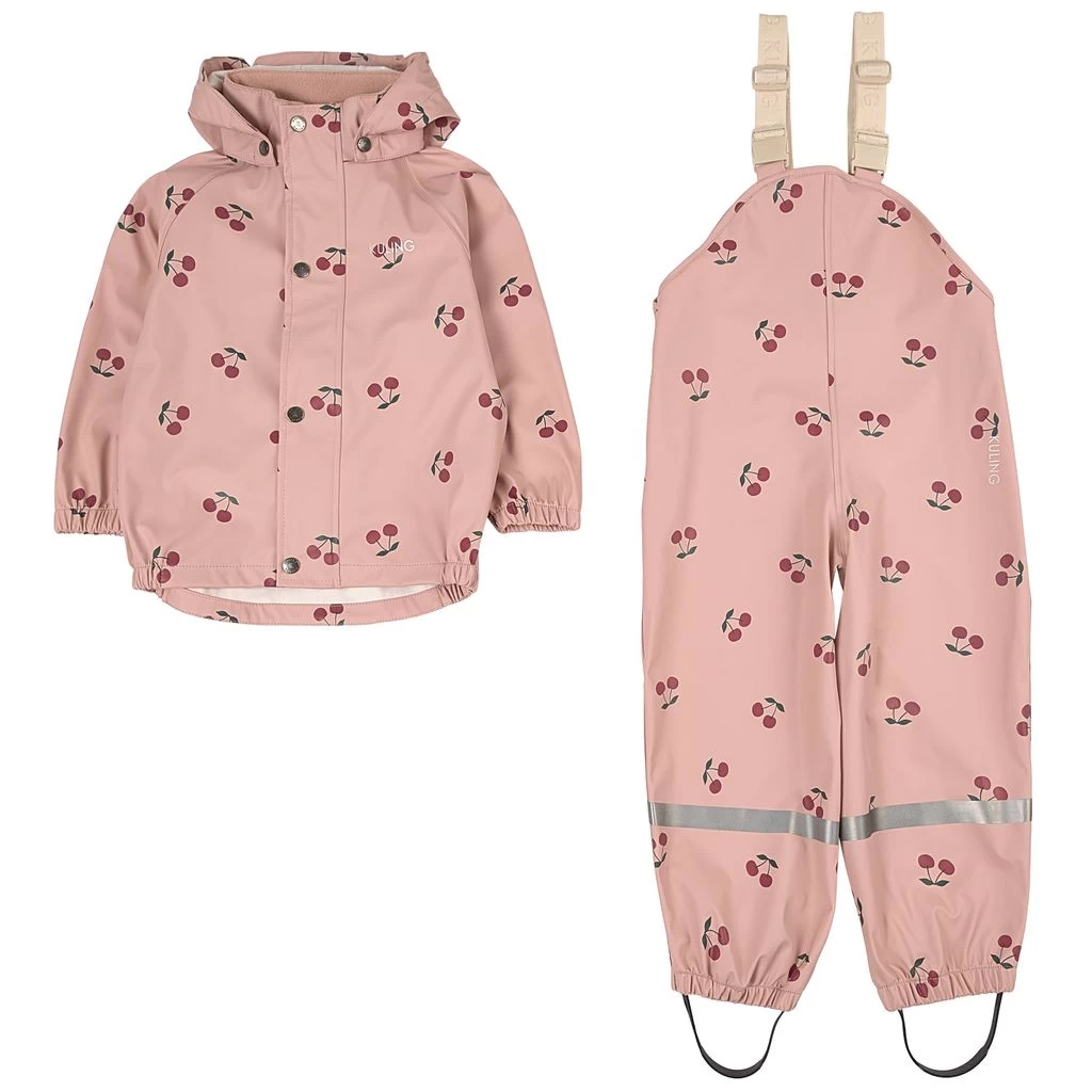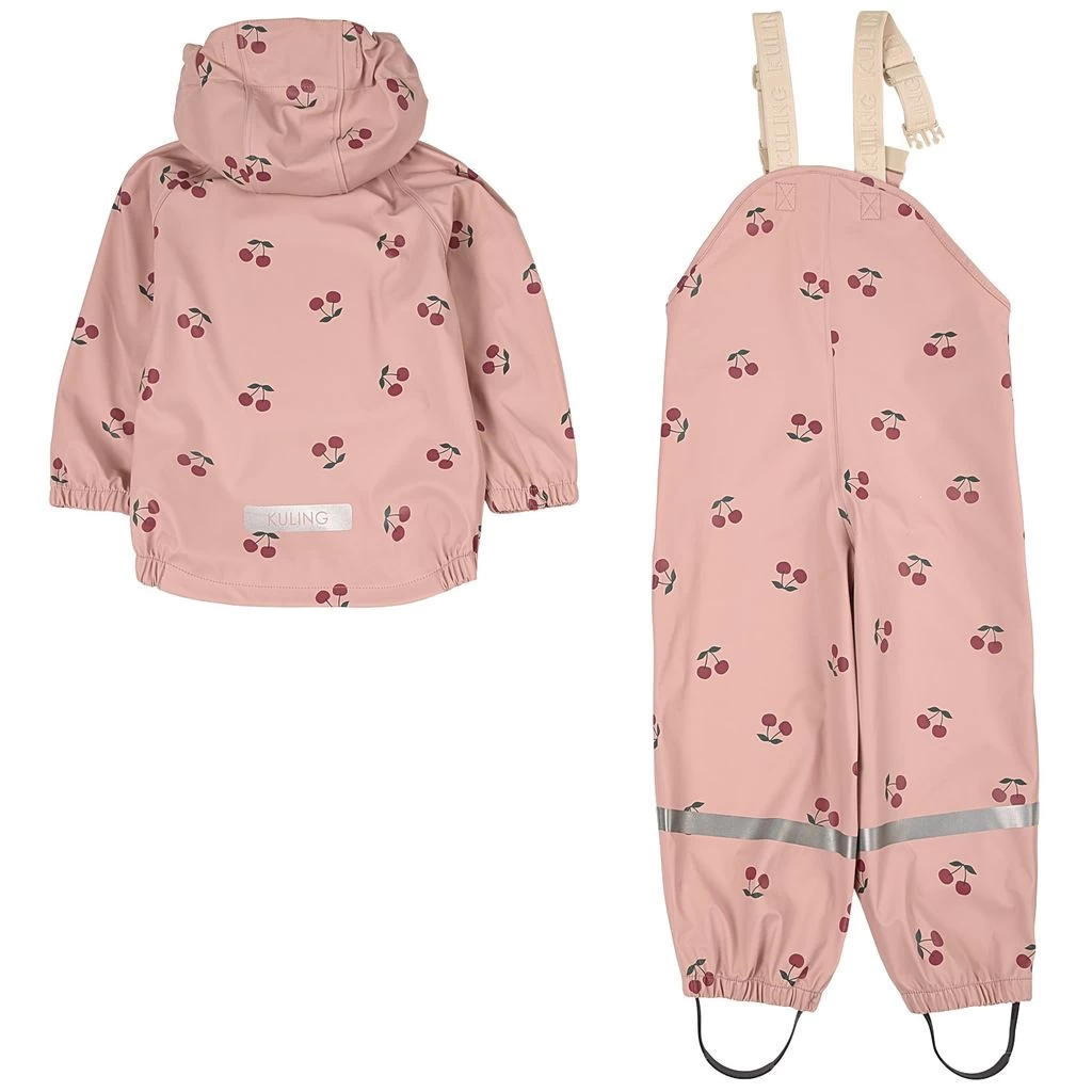 Time to jump through puddles. Pink San Marino rain set by Kuling. The set has welded seams. It has a jacket with a detachable hood, a zip closure at the front and elasticated cuffs, pants with adjustable, elasticated shoulder straps, snap buttons at the sides, a front pocket, elasticated cuffs and adjustable, detachable foot loops and reflective details for visibility.
