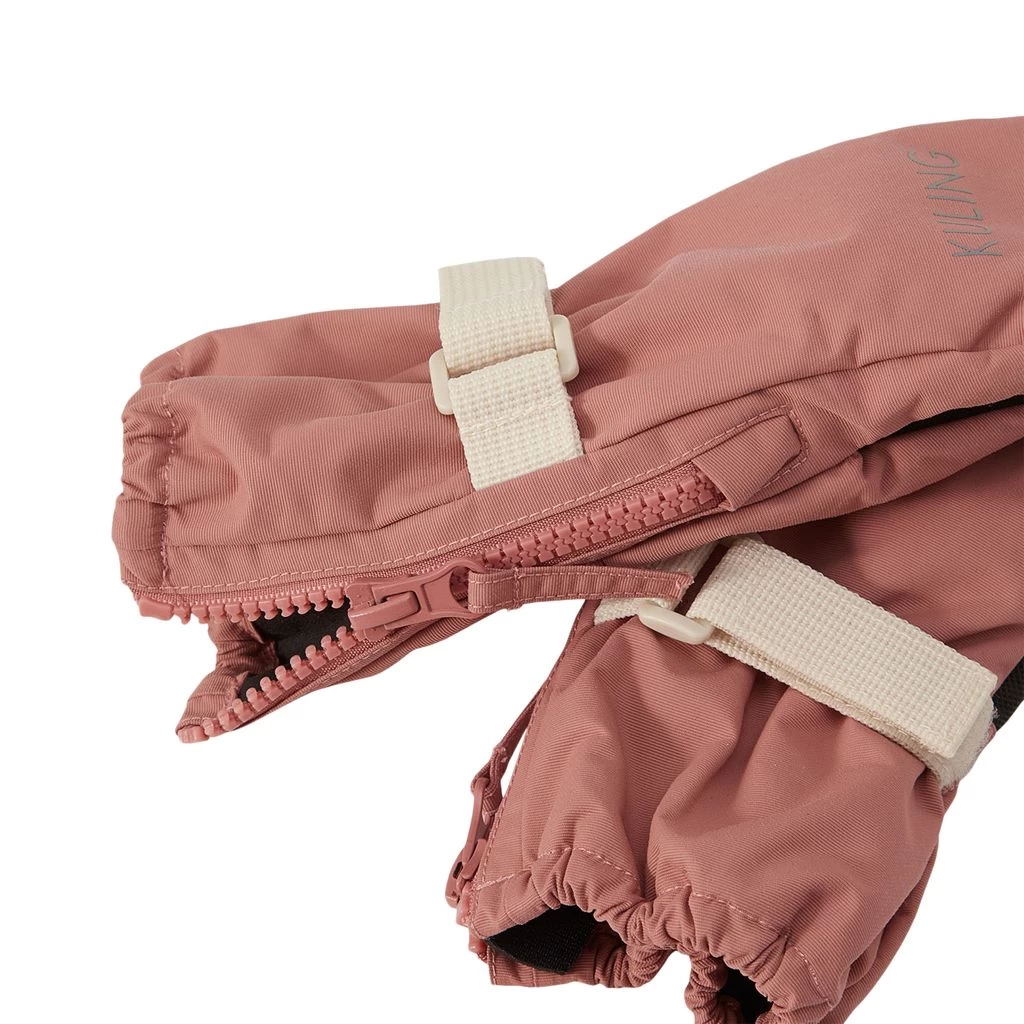 Keep little hands warm. Pink Tallinn mittens by Kuling. The mittens have taped seams. They have a fleece lining, an elasticated wrist with a velcro closure, a zip closure at the side and a reinforced palm.