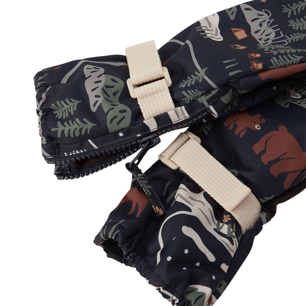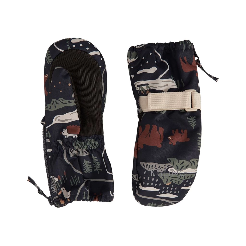 Keep little hands warm. Navy Tallinn mittens by Kuling. The mittens have taped seams. They have a fleece lining, an elasticated wrist with a velcro closure, a zip closure at the side and a reinforced palm.
