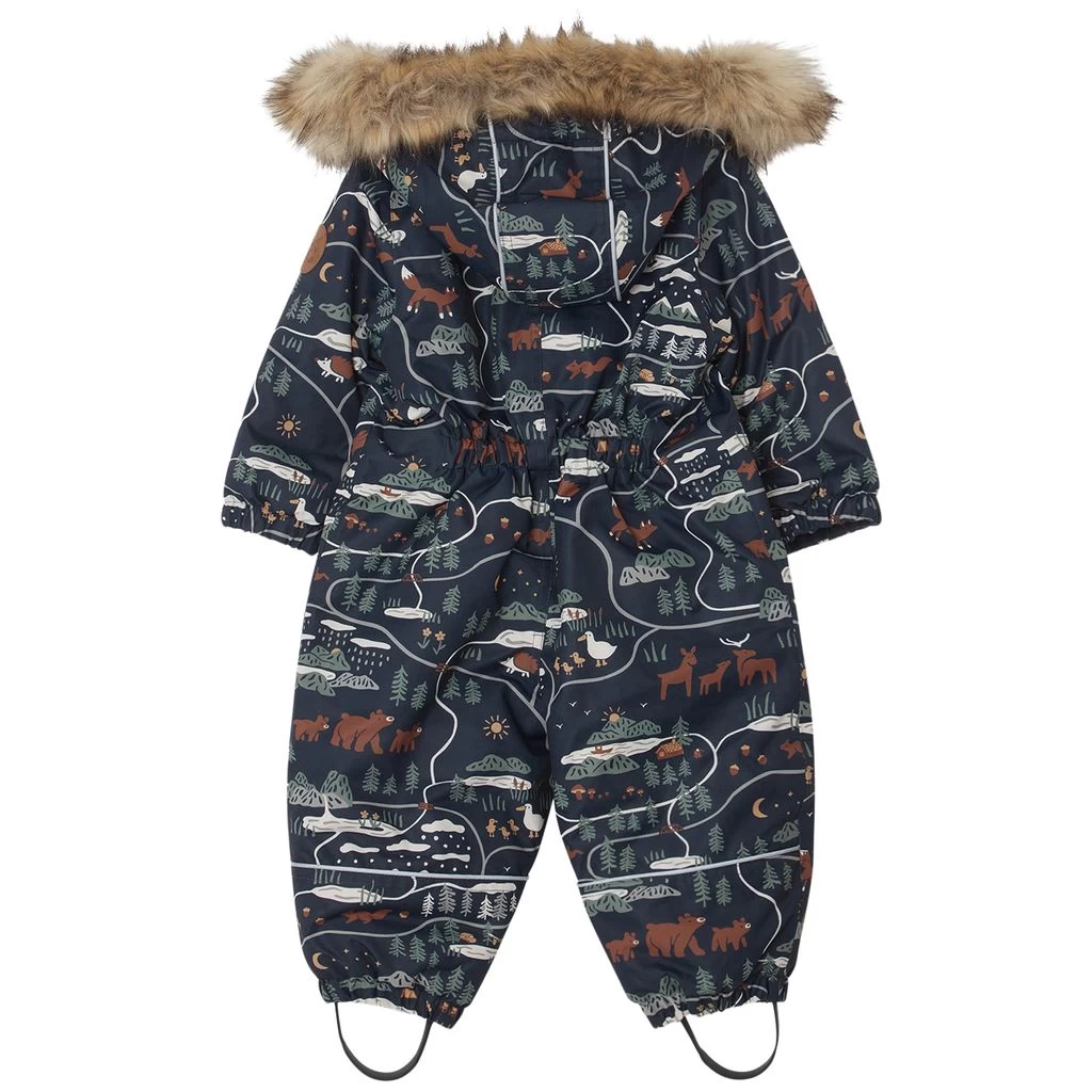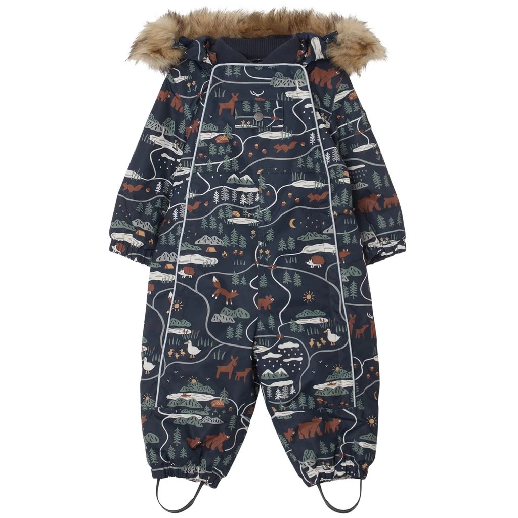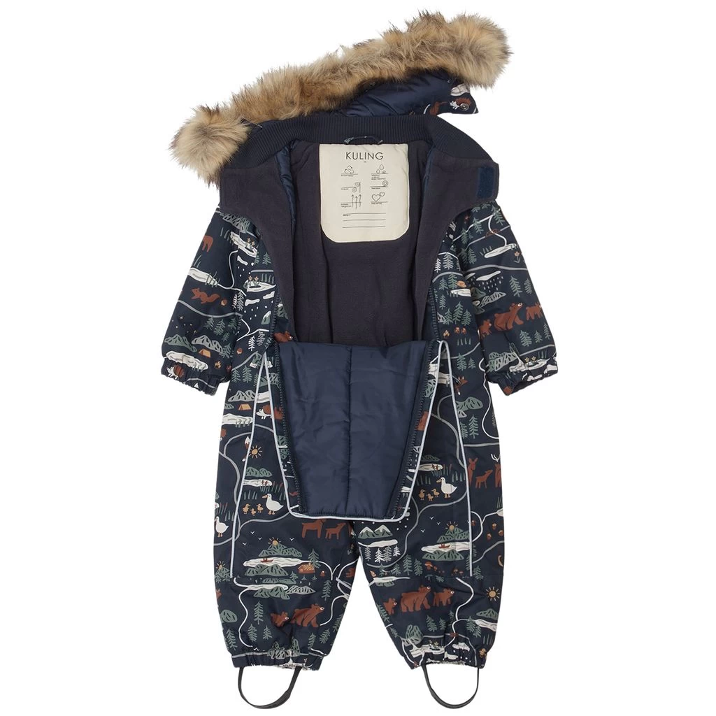 Be warm and comfy on winter adventures. Navy Val D’Isere snowsuit by Kuling. The snowsuit has taped seams. It has warm padding, a soft fleece lining at the back, a detachable hood with a detachable faux fur trim, a zip closure at the front, two front pockets, elasticated cuffs, durable, adjustable silicone foot loops and reflective details for visibility.
