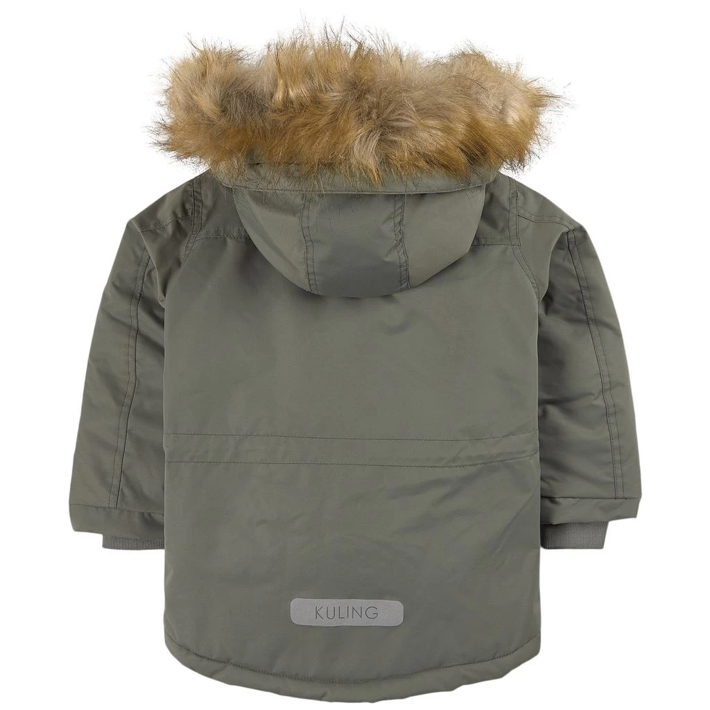 Green Val Thorens parka by Kuling. The jacket has taped seams. It has a zip closure at the front, a detachable hood with faux fur trim, an adjustable waist, two front pockets, a zip pocket at the chest and a reflective detail for visibility.