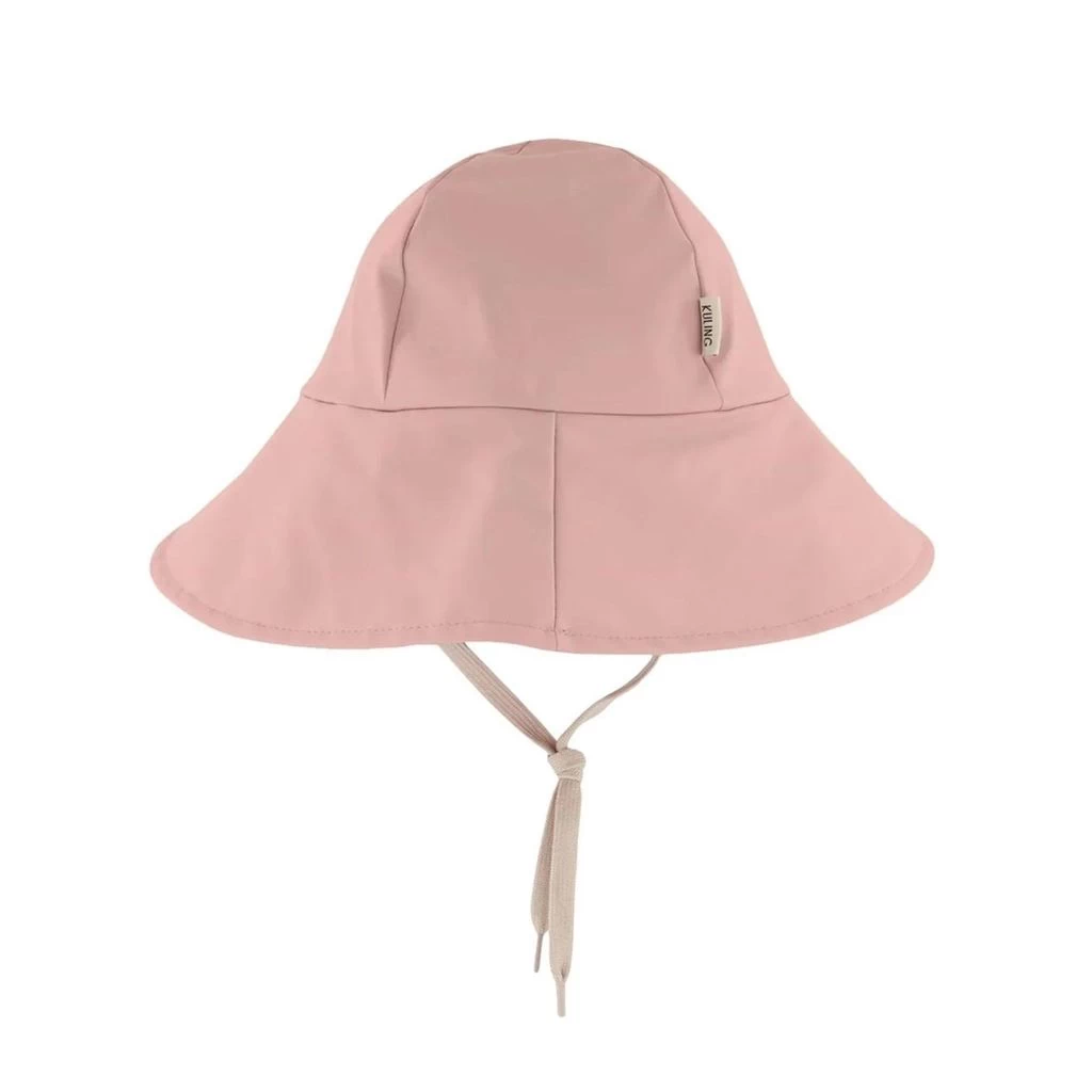 Rainy days will be so much fun. Pink Vasa rain hat by Kuling. The rain hat has welded seams. It has a bonded lining, a wide brim, fleece lined earflaps and tie strings at the chin.