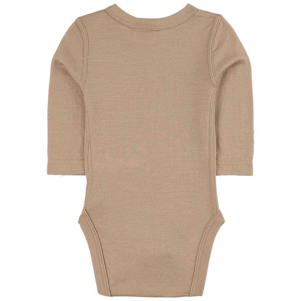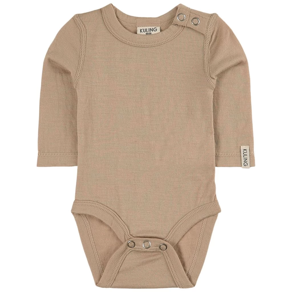 Beige baby body by Kuling. The baby body has snap buttons at the shoulder and between the legs.